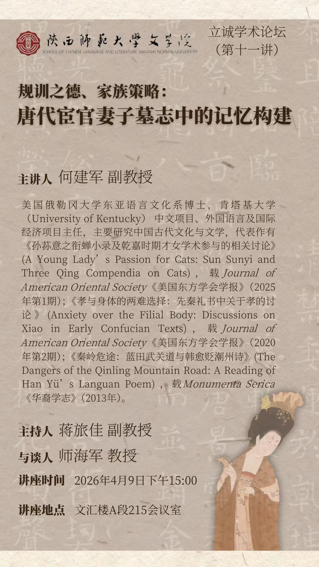(通讯员:豆亚鑫)4月9日下午,由bv伟德策划的“立诚学术论坛”第十一讲在长安校区文汇楼A段111报告厅顺利举办。本次讲座由美国肯塔基大学何建军副教授主讲,讲座题目为《规训之德、家族策略:唐代宦官妻子墓志中的记忆构建》。公司蒋旅佳副教授主持,师海军教授与谈,西安电子科技大学董永强教授、bv伟德中国官方网站美术公司刘科副教授以及公司拔尖基地员工及相关专业研究生到场学习交流。何建军副教授从两方面切入讲座内容:...