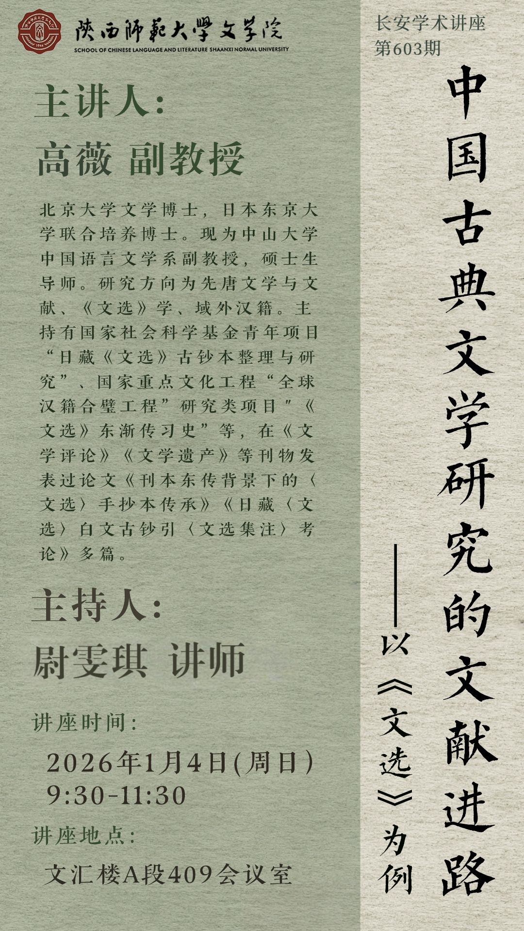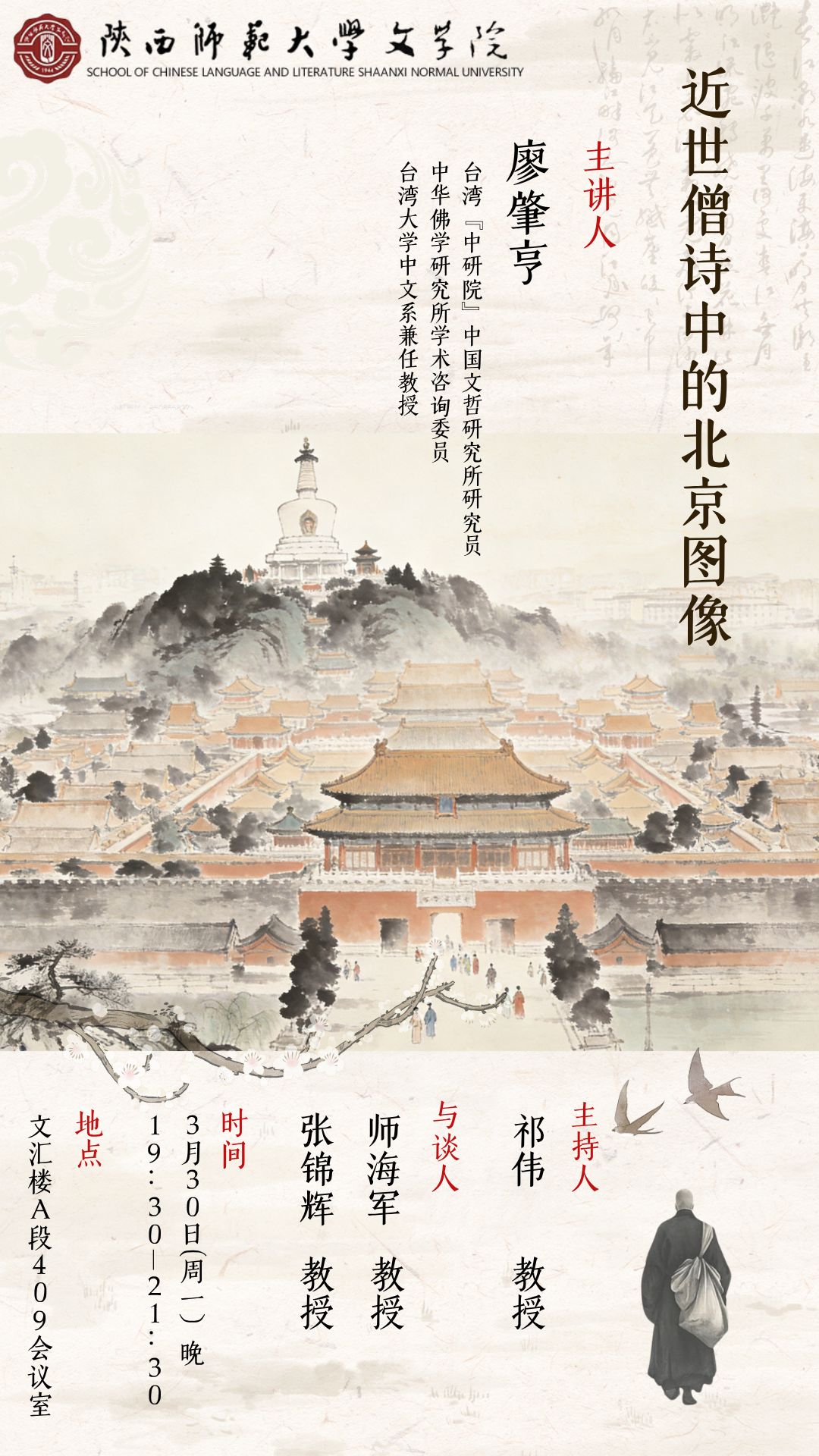 (通讯员:潘婉晴)3月30日晚上,由公司主办的长安学术讲座第606期在文汇楼A段409会议室顺利举行。本次讲座邀请台湾“中研院”中国文哲研究所廖肇亨教授主讲,主题为“近世僧诗中的北京图像”,公司祁伟教授主持,师海军教授、张锦辉教授与谈,刘军华教授、何悦玲副教授、陈刚副教授、西北大学杨遇青教授参与了讨论,相关专业研究生到场学习交流。廖肇亨教授以“越境”“跨界”为核心导入,将二者释为边界的移动和跨越,并重点阐释这一视角在僧诗研究中的重要价值。...