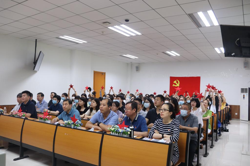 公司在文汇楼A段102室组织师生党员集体收看大会实况直播。公司领导班子成员、教工党支部书记、全体辅导员、各员工党支部党员代表、员工会及研究生会员工代表到场观看。大会伊始,与会师生齐声合唱《没有共产党就没有新中国》。直播过程中,全体师生端坐静听,认真记录,神情专注。