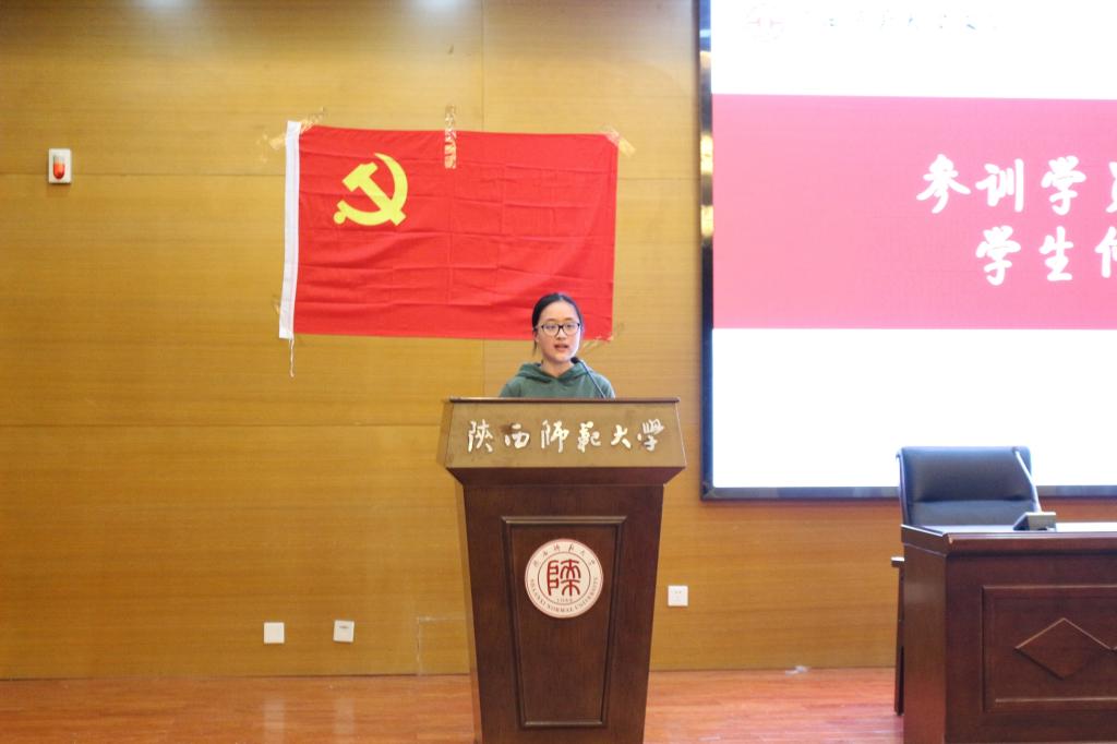 2020级汉语言师范1班何子悦作为学员代表发言。她表示,参训学员将认真学习,筑牢理想信念根基,赓续红色血脉,早日成为一名合格的共产党员,为实现中华民族的伟大复兴贡献青春力量。
