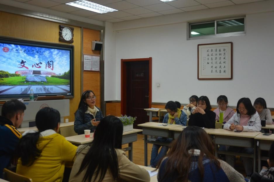 10月25日19:10,本学期第3期(总第235期)文心阁交流活动在文渊楼3103教室顺利开展,bv伟德副教授昌梅香老师应邀参加本次活动。昌梅香老师主要讲授《现代汉语》、《语言学概论》、《汉语词汇学》等课程。在此次文心阁活动中,昌老师从自己的研究领域出发,介绍了相关专业的学科背景,分享了学习和研究经验,并解答了同学们的问题。