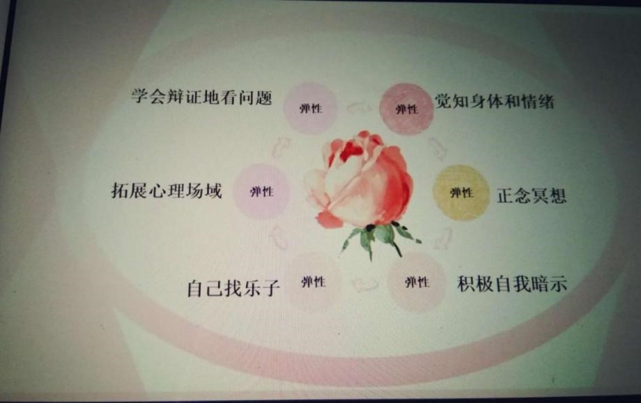 在"增强自我弹性"环节,毛老师结合自身的经历和相关心理实验提出了六条有效的建议和方法,即学会辩证地看问题——任何事情都有两面性;觉知身体和情绪——莫要忽略躯体抑郁,学会表达让情绪见光;拓展心理场域——面对压力能做到收缩自如;正念冥想——通过科学调节来放松身心;自己找乐子——拥有好心情,才能更高效地学习;积极自我暗示——"如果一件事情有办法解决,担忧是没必要的。如果一件事情没有办法解决,担忧是没有用的。"