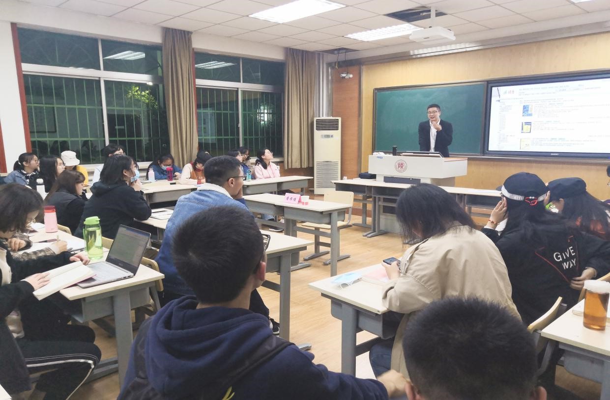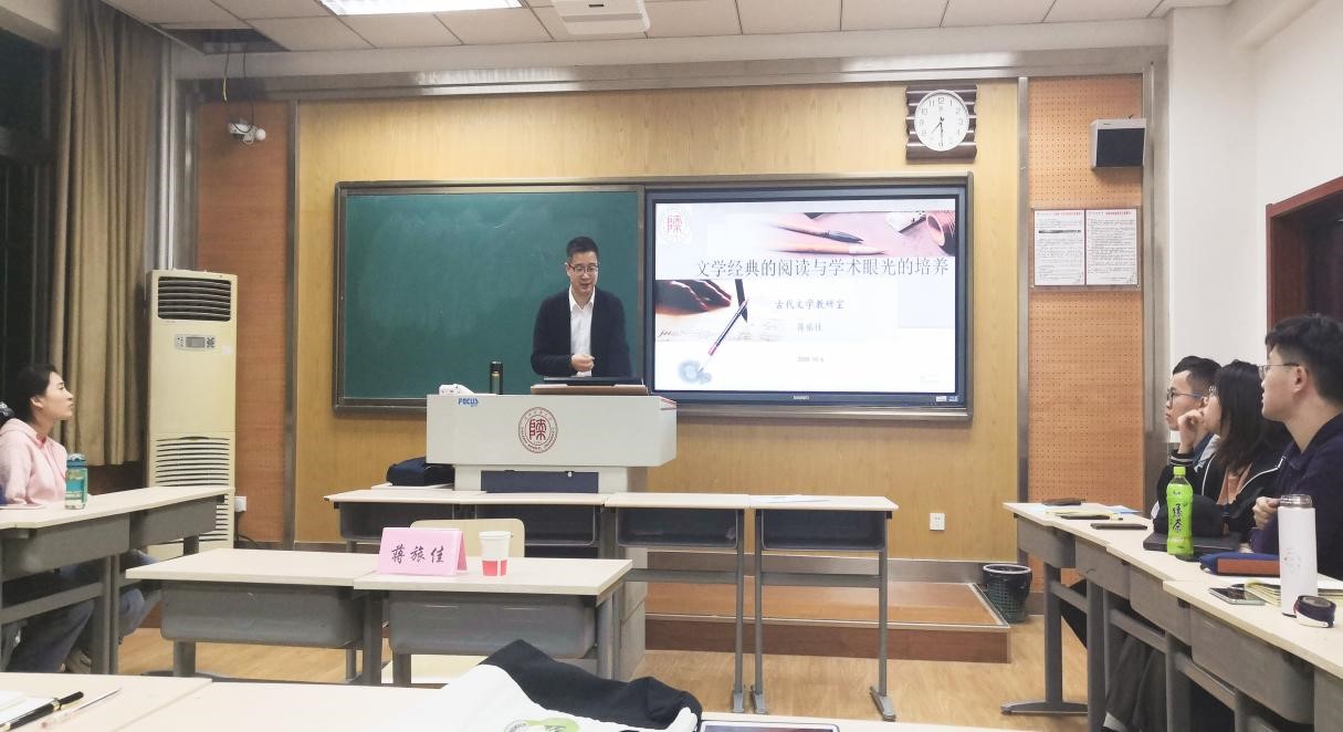 活动伊始,蒋旅佳老师先回顾了自己丰富的求学经历,从一位老师和长辈的角度漫谈求学深造的话题。老师幽默风趣的语言调动了现场气氛,拉进了师生之间的距离。他认为相较于其它学科,古代文学这门学科更注重考验学者的耐力。藉此蒋老师希望各位同学能够珍惜本科阶段的知识积淀,这对日后的思维和学术洞察力有极其深远的影响。而后,蒋老师引用马悦然《二十世纪欧洲汉学》,强调阅读是一切研究的基础,并以唐代诗人卢纶的作品《和张仆射塞下曲》为例,通过文本内部细读及明清两代人的评价,由表及里,深入探究。话锋一转,蒋老师又以数学家华罗庚对该诗的评价,提醒各位同学在文学批评中要注意不同学科及不同地域背景所带来的批评视角的差异。并通过《和张仆射塞下曲》强调,首读应当注意对文本的把握,通过内部解读和文献史料的整理,超越文字的表面,突破惯性思维,注重个人学术眼光的培养。蒋老师以文章中的同文异体与同文异题为切入点,告诫员工在研究过程中不要害怕重复,鼓励同学们大胆尝试以旧材料、新方法得出新成果,他还就同学们在论文写作过程中出现的文献检索问题提出了有效的解决方法,最后以左东岭教授对“诗话”文体的辨析,启发同学们要于无疑处有疑。