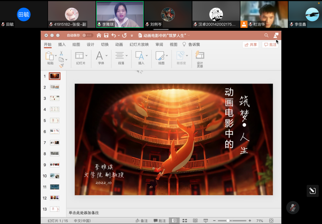 10月14日晚,本学期第2期(总第304期)文心阁师生面对面交流活动在线上顺利举办,bv伟德副教授、文艺学教研室的李雅琪老师应邀参加,以“动画电影的‘筑梦人生’”为主题,和同学们进行交流探讨。