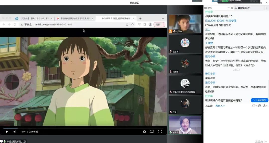 在互动提问环节,李老师和同学们共同探讨了中国动画电影的未来发展方向、在语文课堂中如何更好地进行文学原著和改编电影的对比教学等问题。最后,李老师祝愿大家可以像宫崎骏对待艺术那样,永远为自己怦然心动的人和事物付出时间和感情。