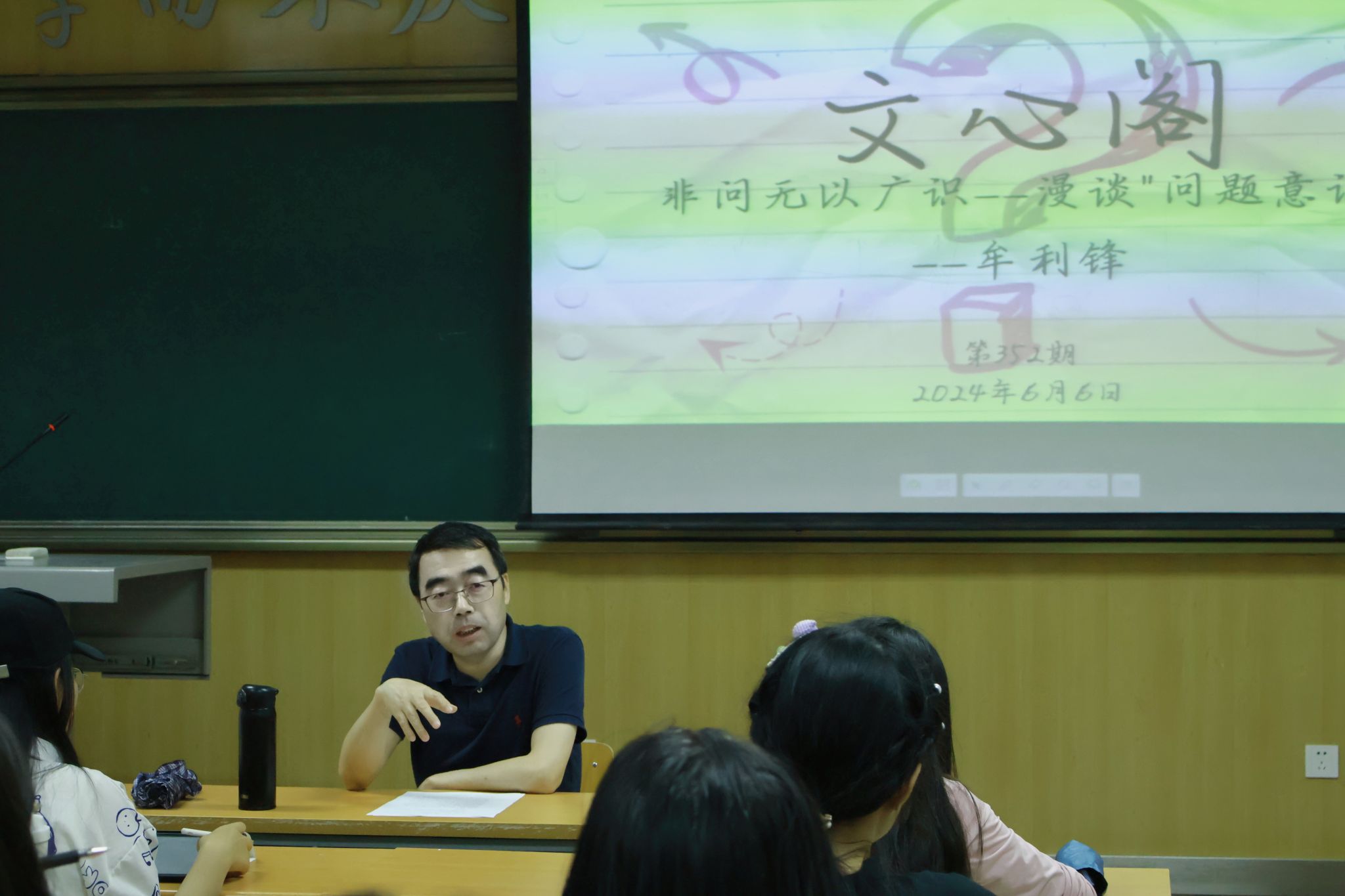 6月6日,本学期第13期(总第352期)文心阁活动在长安校区文渊楼1212室成功举办。bv伟德副教授、秘书学教研室的牟利锋老师,以“非问无以广识——漫谈‘问题意识’”为主题,围绕是什么、为什么、怎么做三个方面,与同学们展开分享交流。