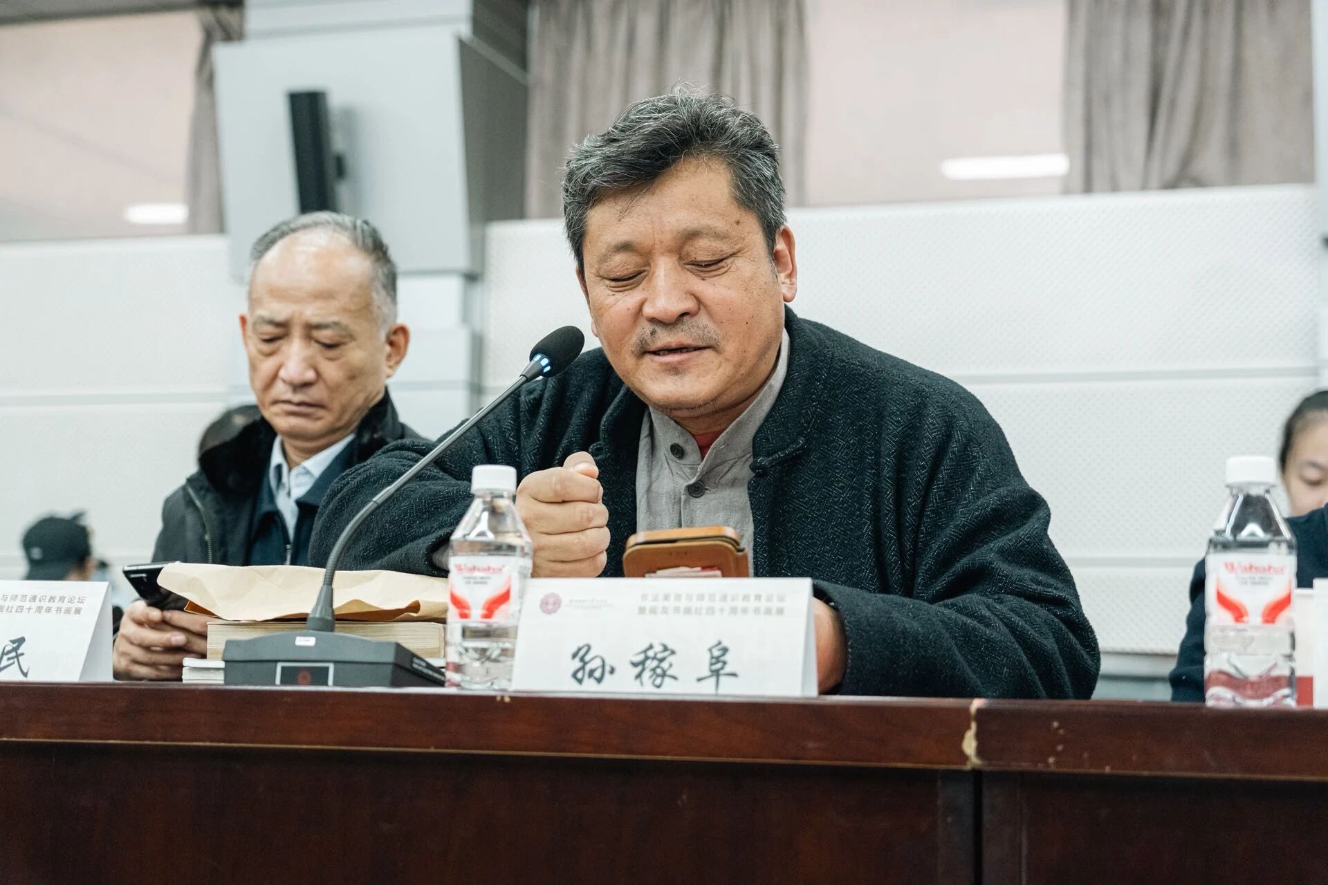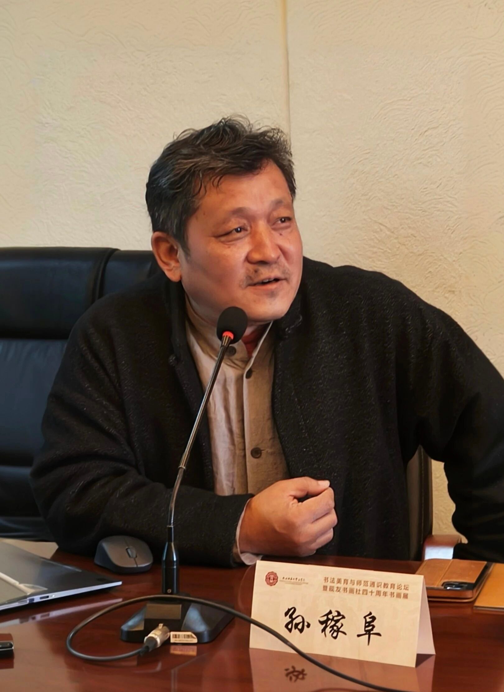 砚友书画社社员代表、88级员工孙稼阜致辞。他结合自身体会阐述书法与传统文化之间的内在联系,并呼吁大家珍惜与书法、与社团的缘分,让书法艺术与前辈的精神永远传承。