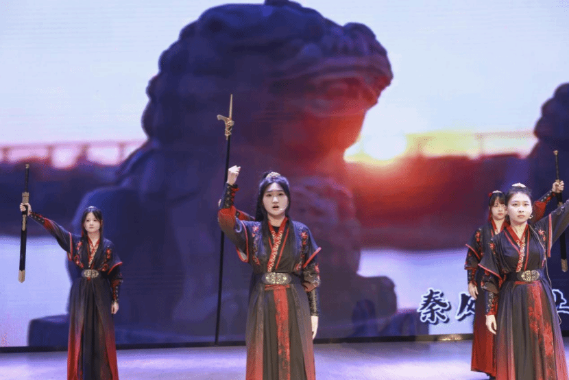 比赛中,参演同学精神饱满,配合默契,奉献了一场精彩的吟诵表演。演出由激昂鼓点拉开序幕,引领观众步入两千年前的秦军阵营。在铿锵有力的独吟与合吟声中,传递深厚的战友情谊与昂扬斗志。最后,以深情咏叹,表达生死相依的坚定与“与子偕行”的誓言,将家国情怀与袍泽之谊娓娓道来。整场演出淋漓尽致地展现了集体主义精神与保家卫国的豪情,赢得评委与观众的高度认可。