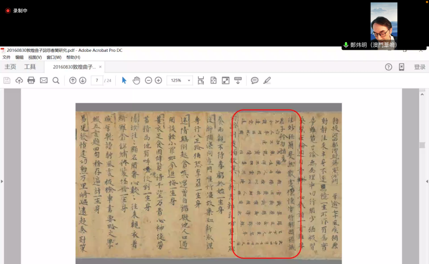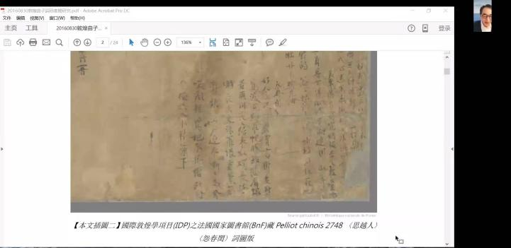 (通讯员:王君妍)2022年4月2日上午9:00-11:00,公司以“交流·发展”为主题的文学文化系列讲座第二讲“敦煌曲子词《怨春闺》研究——从伯2748号卷子上的一条裂痕重新出发”于云端开讲。讲座由香港大学饶宗颐学术馆高级研究员、副馆长(学术)郑炜明主讲,公司柏俊才教授主持,李占鹏教授点评。本次讲座受到学界高度关注,线上参会人数达百余人。