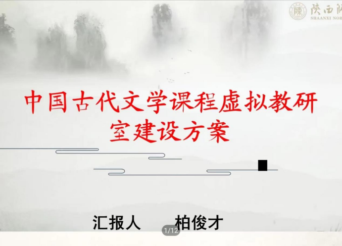 柏俊才教授作为国家级中国古代文学虚拟教研室负责人宣读古代文学虚拟教研室建设方案,围绕建设基础、建设目标、建设内容、建设成果四个方面进行讲解。其中重点建设内容包括以下四点:加大力度研发长安与丝绸之路文化课程;利用西部师范大学教育创新联盟平台,加强西部高校联系,合作开发“长安向西:丝绸之路与唐诗之路虚拟仿真教学实验”;编辑出版《中国古代文学经典诵读200篇》,借助陕师大秦风诗社开发古典诗词吟唱智能虚拟仿真教学实验系统;在现有《中国古代文学史(上)》《十三经导读》《大学语文》三门国家级一流课程古代经典著作作品鉴赏的基础上,开发中国古代文学经典鉴赏智能数据库。