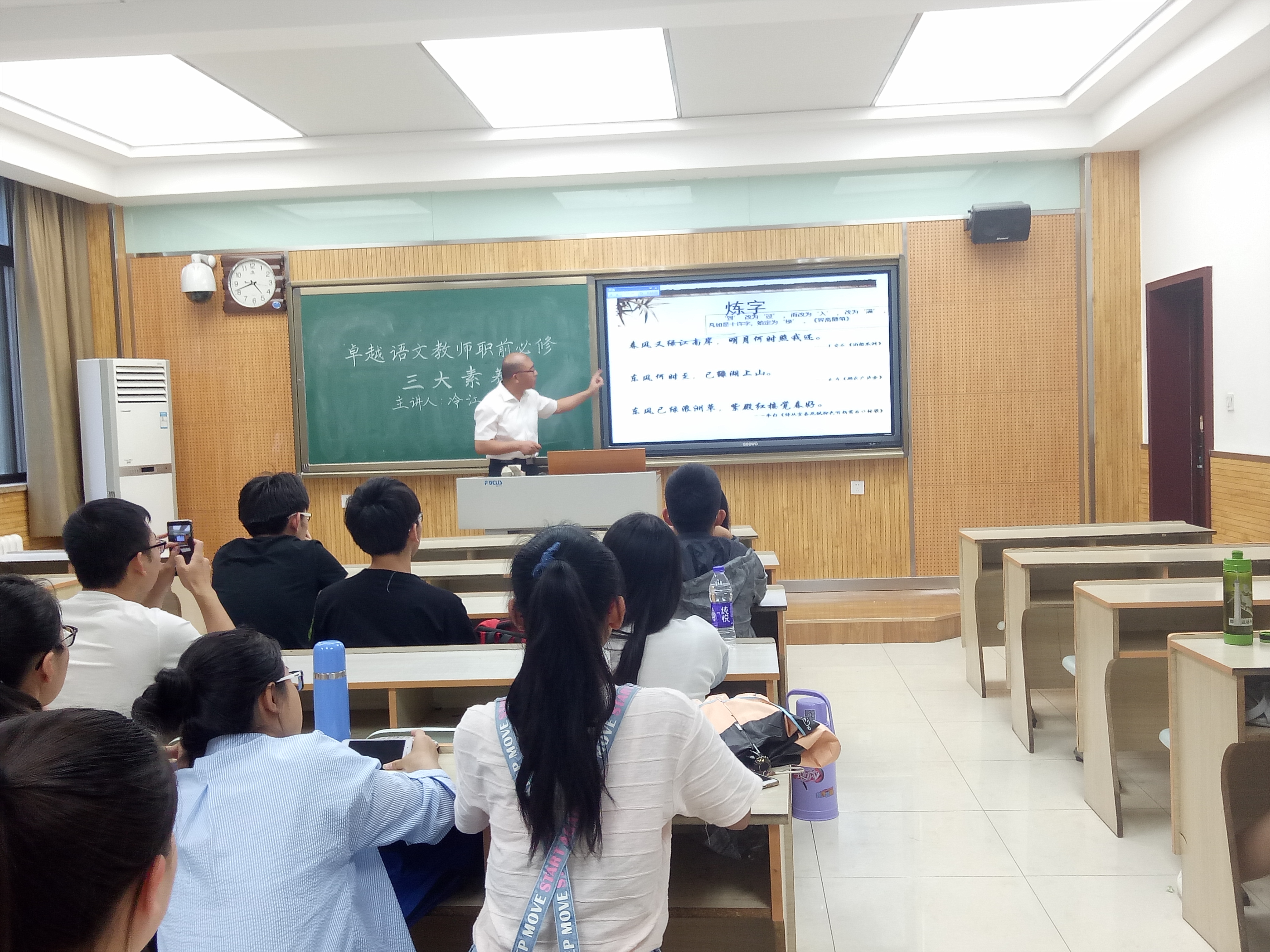 在将近两个小时的讲座中,冷老师为同学们讲解了卓越语文教师职前必修的三大素养——专业素养、教学技能与管理方法,并对同学们做了寄语与期望。冷老师希望同学们专业精深,涉猎广博;倾心于渔,醉心求索!理论高远,技能扎实;力足应用,知行合一!中外兼修,教管结合;教出境界,教出快乐!一步步向卓越教师的终极目标迈进,将来桃李满天下。冷老师和蔼可亲的形象、文渊博广的才识、滔滔不绝的口才以及娓娓道来的讲解都给同学们留下了深刻的印象,也为同学们指明了今后的学习倾向,更为同学们做出了榜样。这次讲座,坚定了同学们成为卓越教师的信念,也找到了以后奋斗和努力的目标,为今后的老员工活和学习指明了方向。