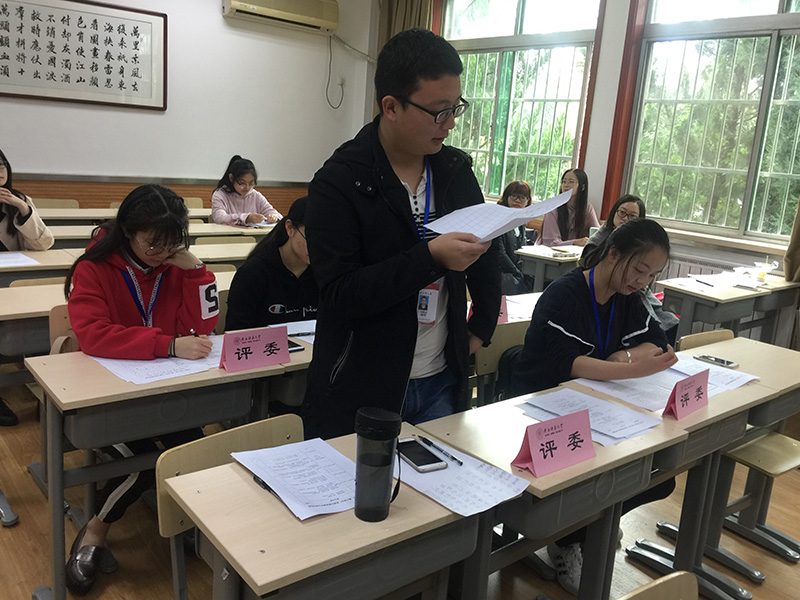 经过分数汇总核算,最终评出一等奖获得者卢文静,二等奖获得者朱琛晨、陈宣贝,三等奖获得者陈欢、王菁华、杨怡环。三位老师分别为获奖同学颁奖,最后,全体参赛选手与评委老师们进行合影留念。