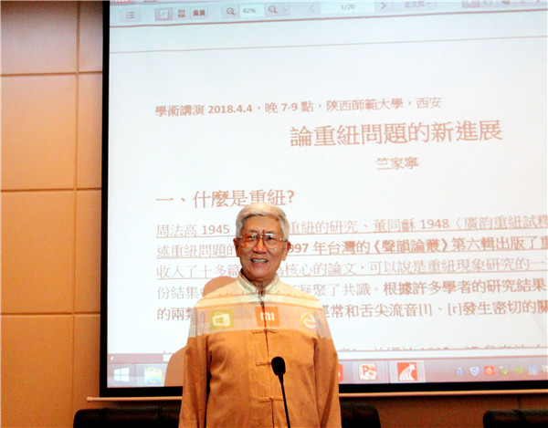 (通讯员:梦城)受公司人文社会科学高等研究院(高研院)邀请,4月4日晚7点,原台湾声韵学会理事长、中正大学中文系主任暨中文所所长、美国IACL理事、博士生导师竺家宁教授在长安校区文汇楼A段111报告厅作了题为《论重纽问题的新进展》的学术讲座。本次讲座由bv伟德中国官方网站人文社会科学高等研究院主办,由bv伟德的胡安顺教授主持并点评,参加本次讲座的师生有bv伟德黑维强教授、惠红军教授、王怀中副教授、柯西钢副教授和汉语硕、博士生以及西北大学bv伟德部分教师共50余人。