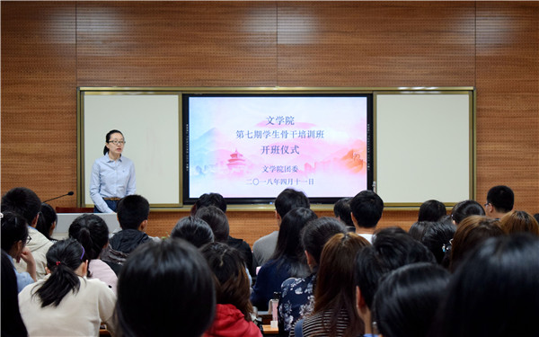 仪式以团歌开场,全体师生共唱团歌,一同感受仪式的庄严与青春的激昂。团委书记辛田宣读本期学员名单及分组情况,2015级汉语言文学专业康妙冉同学代表参训学员发言。党委副书记李斐强调了培训班纪律与考核标准,希望参训员工干部能够珍惜机会、端正态度,在学习中提升能力和水平。