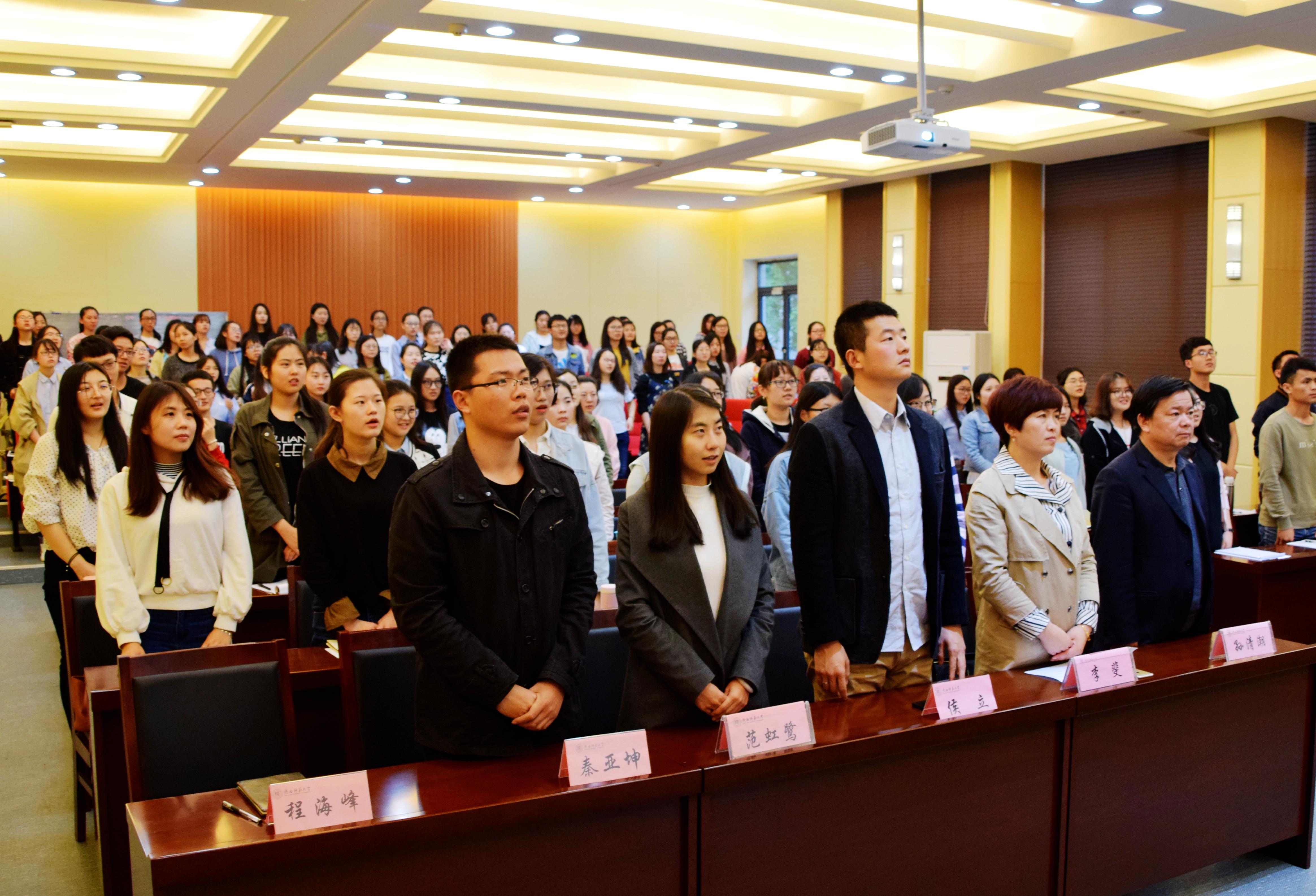 庄严的《国际歌》奏响,辛田宣读本期学员名单和分组。2016级汉语言文学卓越班韩佳萍同学作为学员代表发言,她表示要珍惜培训机会,坚定理想信念,知行合一,坚持自省,争做合格党员。李斐对培训的纪律和考勤作以要求,希望全体学员严格遵守纪律,认真听讲,做好笔记,严肃对待结业考试,坚定入党信念,切实提高党性修养。孙清潮在致辞中,对本次入党积极分子党课培训开班表示祝贺,希望同学们按照党员八条标准严格要求自己,用实际行动为党课培训交出满意的答卷。