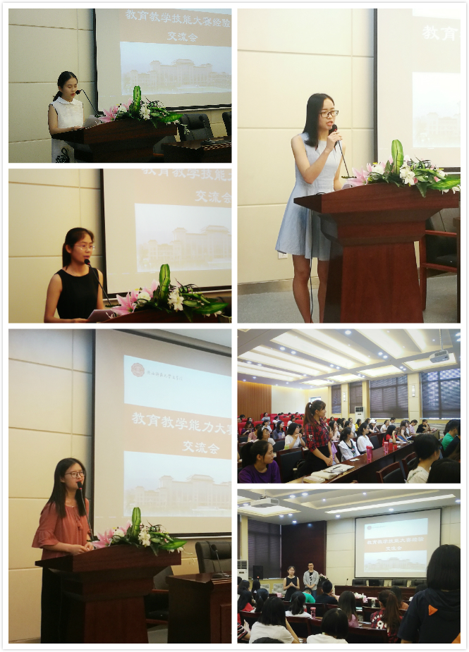 2015级汉语言文学卓越班的刘艳芳首先分享了自己的一些经验与感悟,她建议同学们明确课程标准要求,结合所学专业知识,研读语文必修教材,鼓励同学们积极把握教学实践机会。2015级汉语言文学卓越班的卢文静以亲和幽默的语言鼓励同学克服惰性,打破旧思维,她希望同学们合理安排时间,平衡学业与比赛的关系。2015级汉语言文学三班的刘丹建议同学们注重专业知识的积累,助力对课文的解读;注重公司产品知识的积累,促进教育实践;注重教学技能的练习,不断进步。2015级汉语言文学三班的康妙冉同学鼓励同学们广泛利用多种资源,提高基本教学技能,并分享了几个实用的网站及教具。