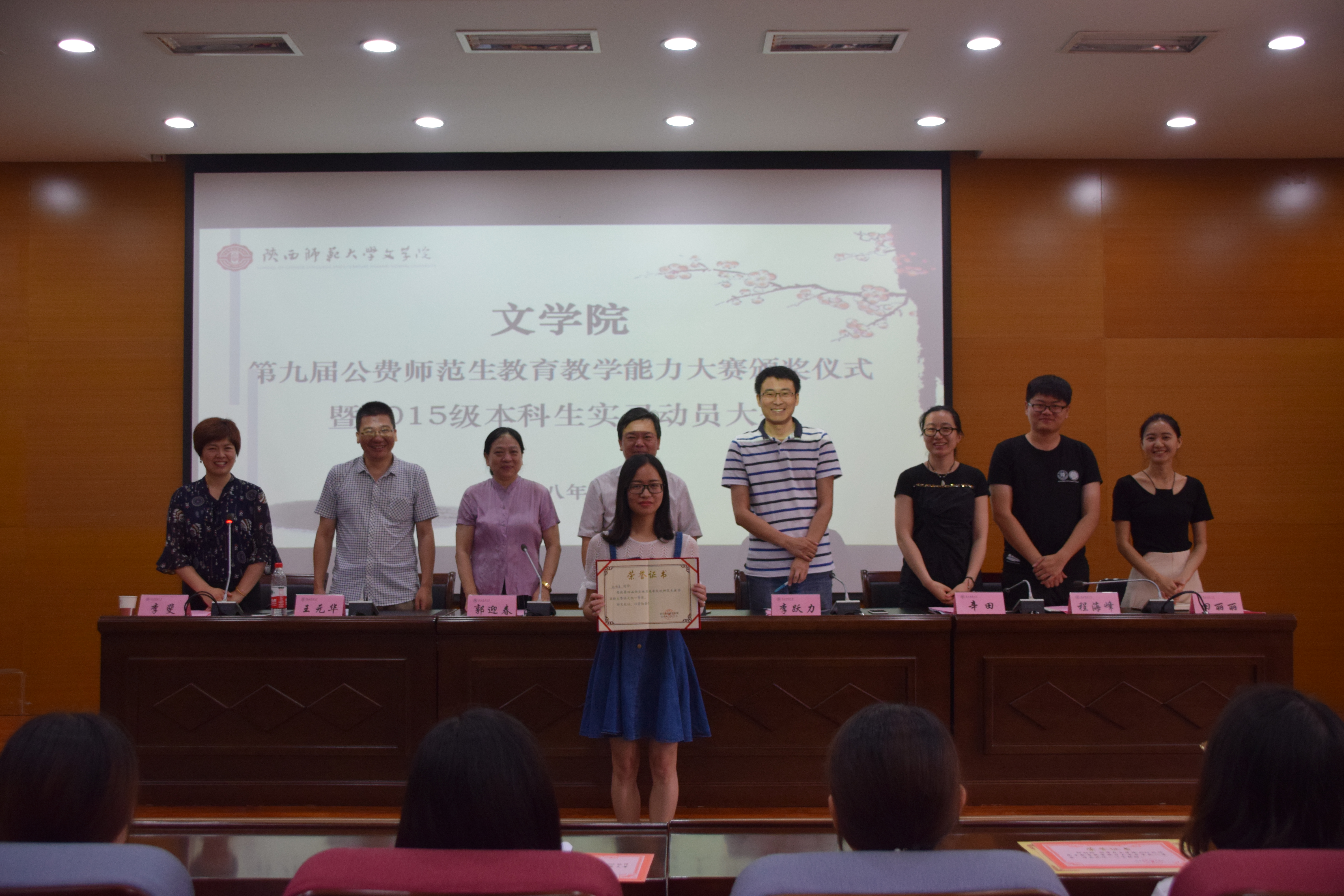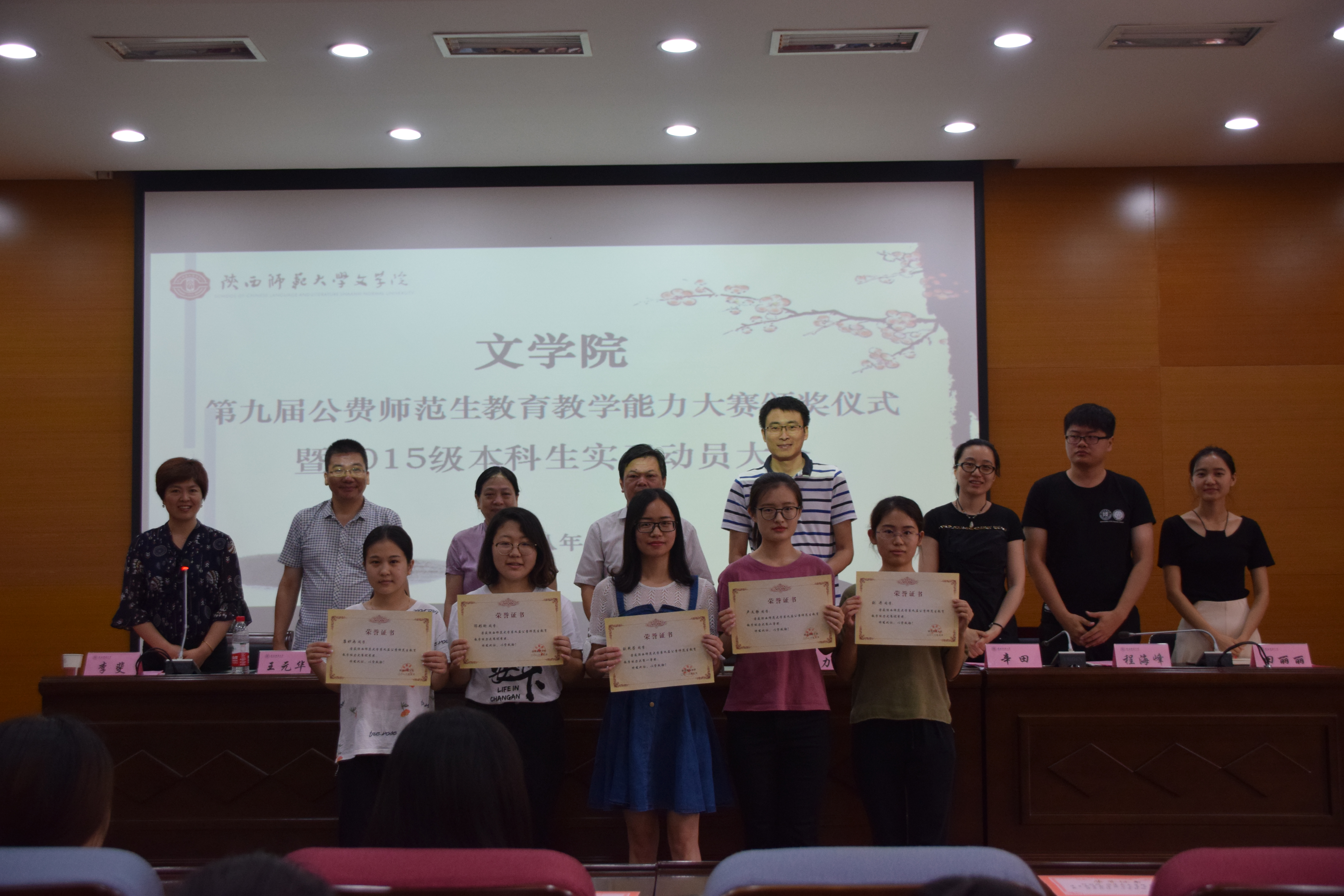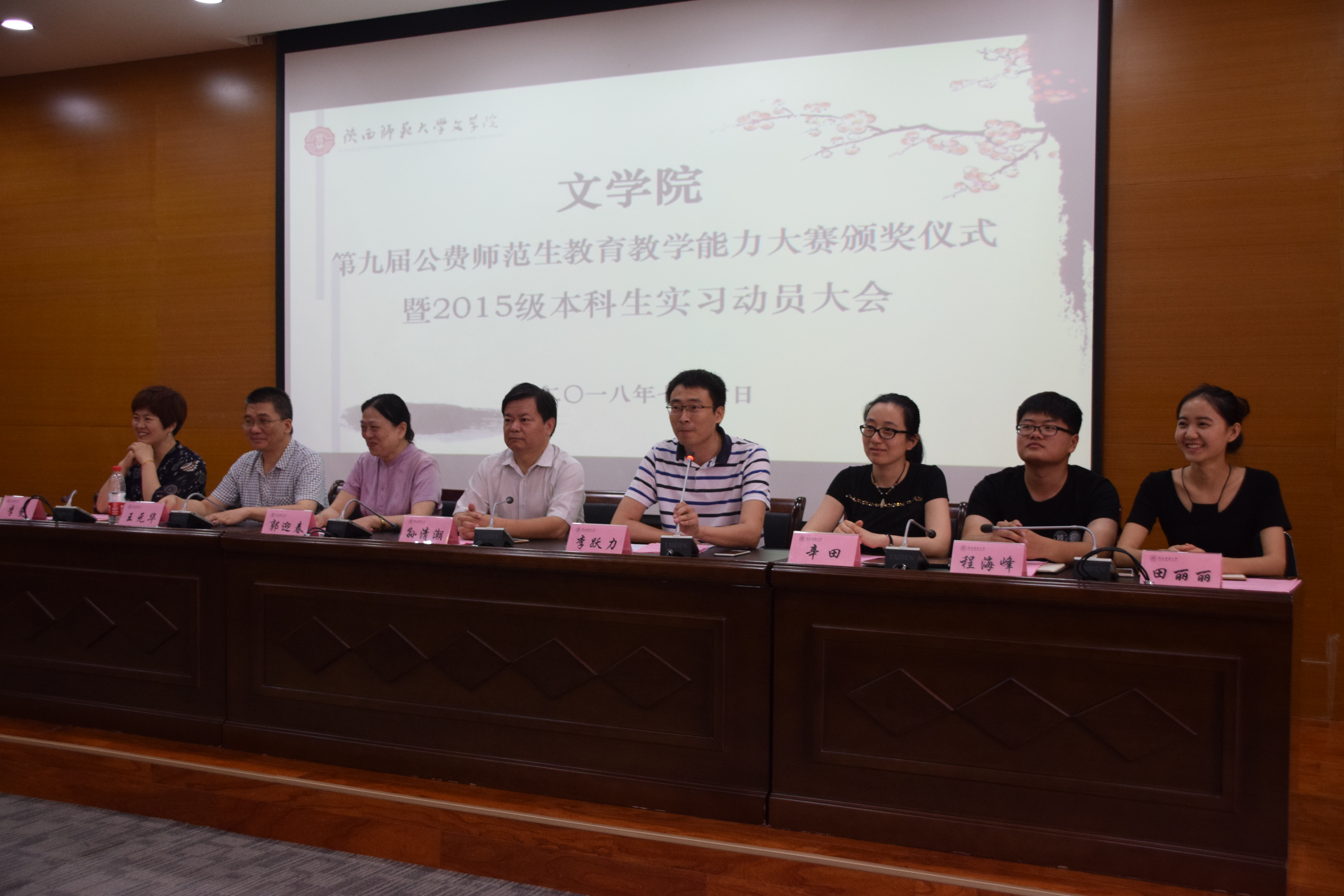 会议伊始,孙清潮书记宣读第九届公费师范生公司产品能力大赛获奖名单及奖金。王元华、郭迎春老师为院级获奖同学颁奖,李跃力、李斐为校级决赛获奖者颁奖,孙清潮为荣获第四届西北地区高等院校师范生教学技能大赛获奖的刘艳芳同学颁奖。颁奖仪式后,李跃力副经理首先对获奖同学表示祝贺,希望同学们积极向获奖同学学习,传承勤恳踏实的治学精神和坚持不懈的优秀品格;随后对2015级本科生实习工作和经费报销情况作了说明和安排。他强调,专业实习是本科学习的重要内容,要高度重视,认真对待,遵守纪律,努力提高自己的综合素质和工作能力。