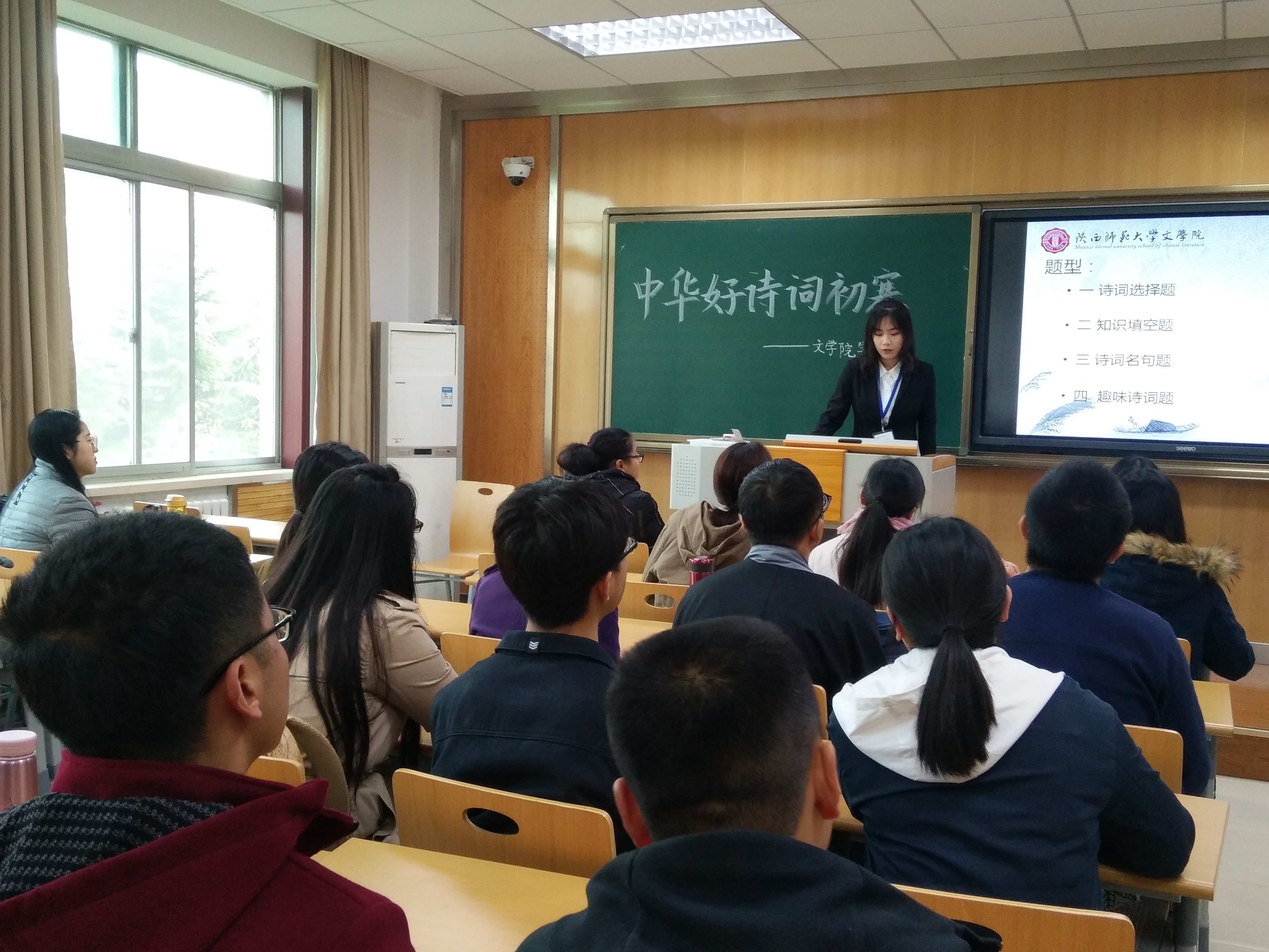11月11日,经过前期一系列准备工作,“中华好诗词”初赛正式开始。2016级、2017级、2018级本科生和研究生共计30支队伍在长安校区文渊楼展开激烈比拼。初赛采用团体竞赛制,每支队伍3-4人,题目由诗词选择题、知识填空题、诗词名句题和趣味诗词题四大部分组成。本科生24支队伍和研究生6支队伍分布在5个赛场,选手们热情高涨,积极作答,现场气氛融洽活跃。