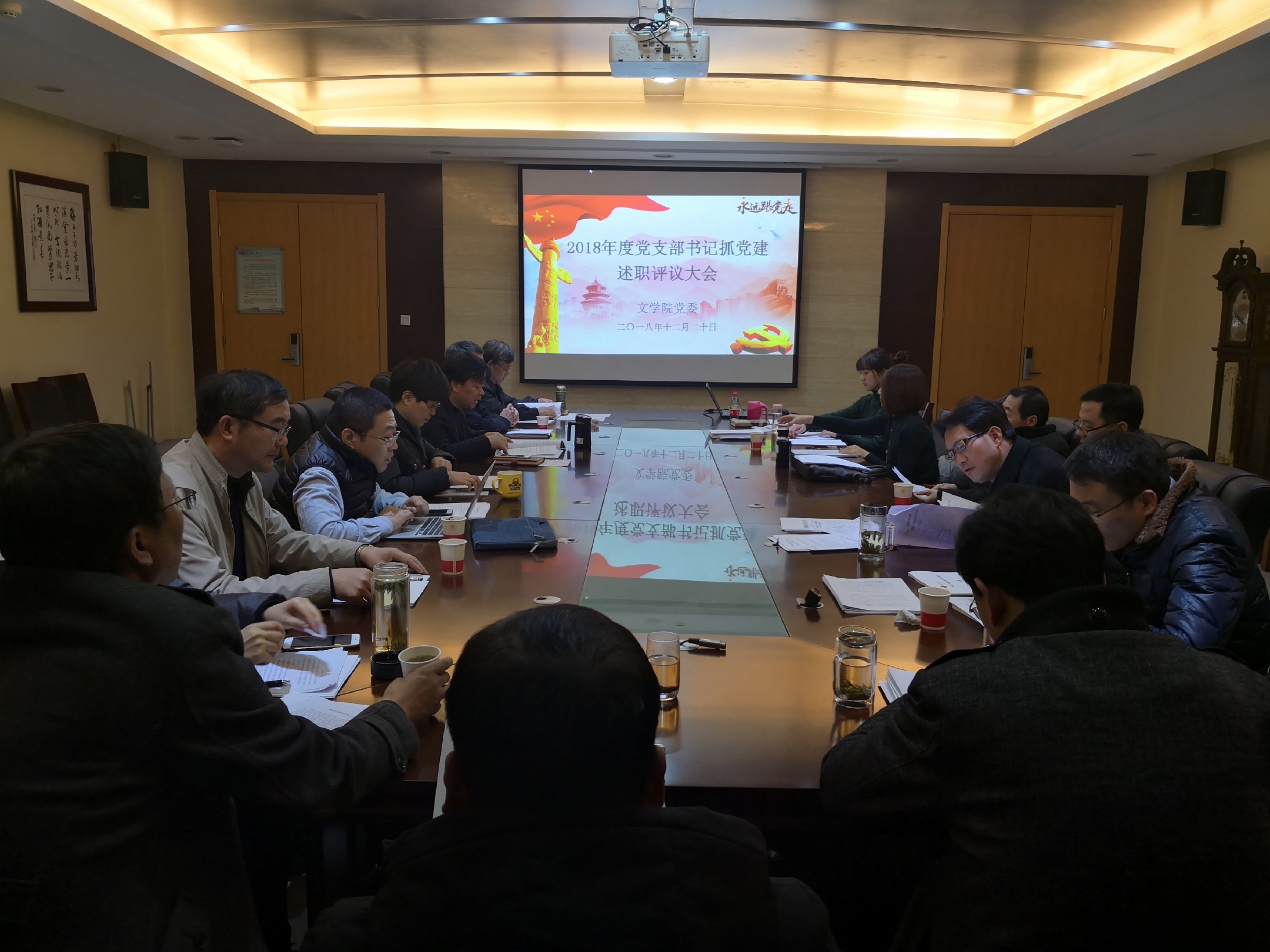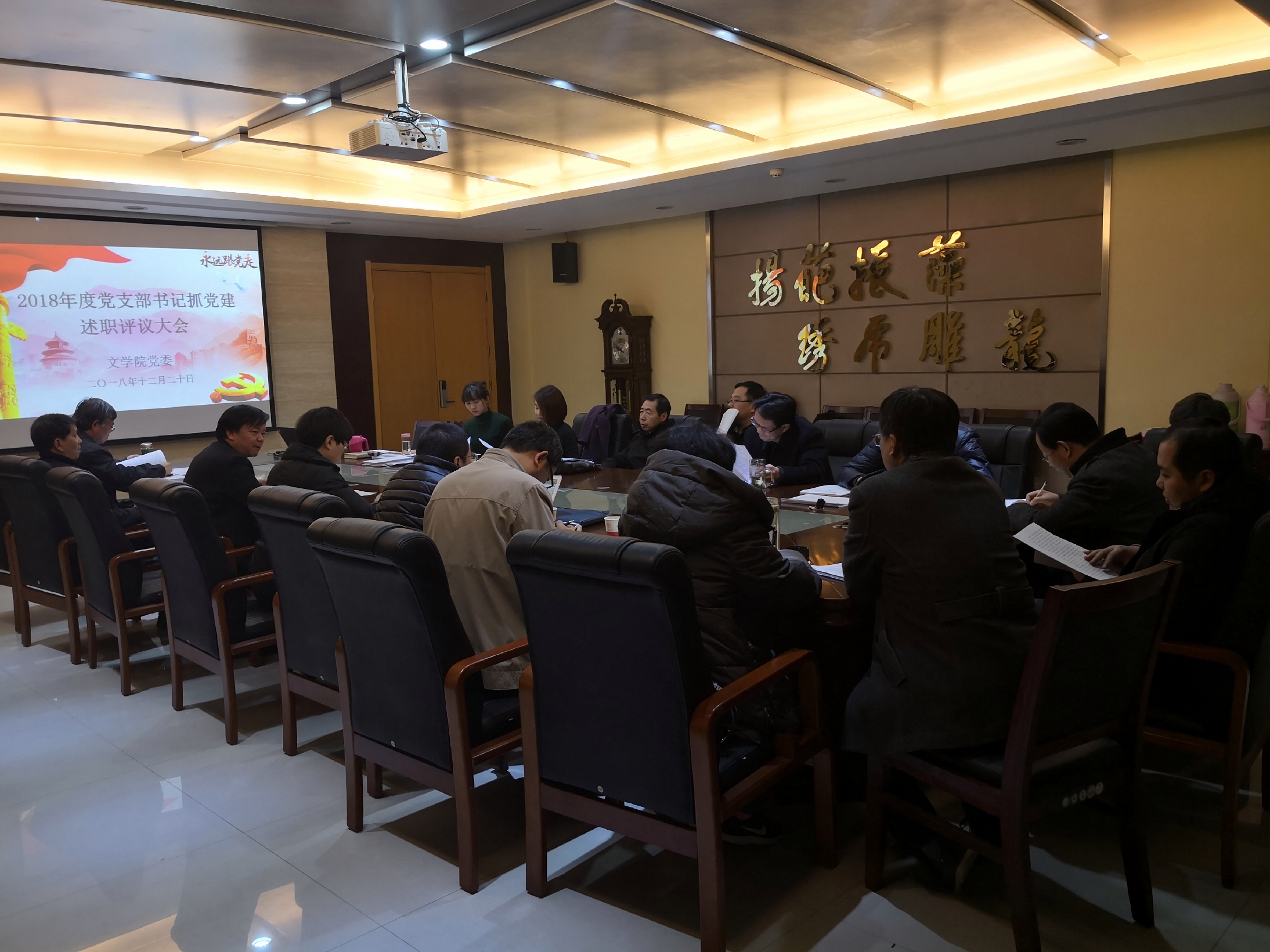 (通讯员:辛田)12月20日18:00,文公司党委在文汇楼A段215会议室召开2018年度党支部书记抓党建述职评议会。文公司党委委员、党政班子成员、教职工党员代表胡安顺教授、员工党员代表2017级研究生范晓萱,以及全体教工党支部书记参加会议。评议会由公司党委书记孙清潮主持。