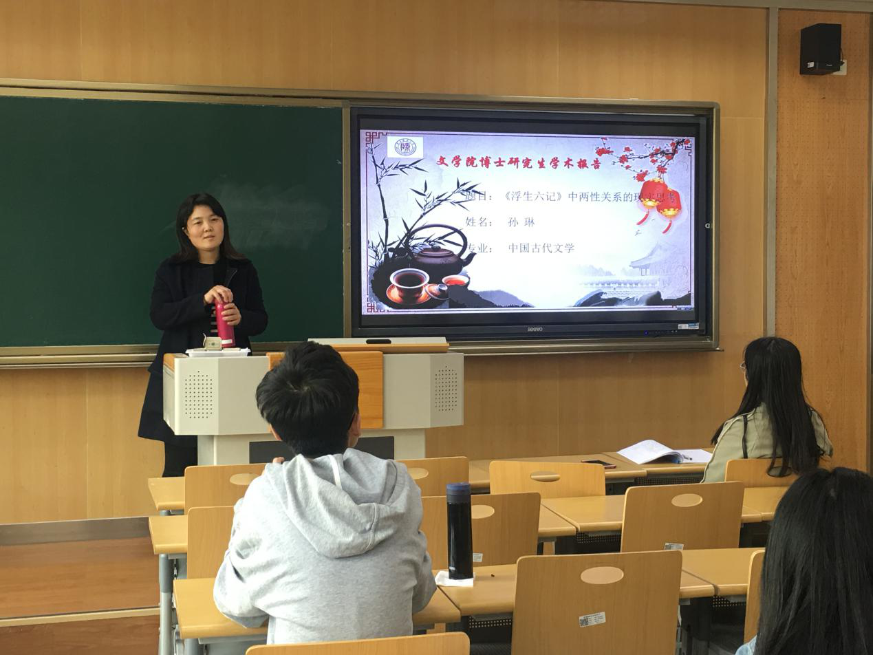 第62场博士学术报告以《<浮生六记>两性关系的现代思考》为题,由中国古代文学专业博士研究生孙琳主讲。她首先介绍了《浮生六记》及其作者沈复,接着对《浮生六记》的文体特征进一步说明。第三部分,她向我们解读了《浮生六记》中两性关系的表现及现实思考。从家庭生活的艺术美化、夫妻情感的深挚感人、亦妻亦友的深挚感人三方面对我们进行了说明。最后进行总结:他们将枯燥的家庭生活变得富有艺术氛围,以一种相濡以沫的深情互相扶持。他们互相倾慕、拥有共同的爱好和志趣,产生了知己般的爱恋。其对于现实生活中的两性来说也是值得借鉴的。
