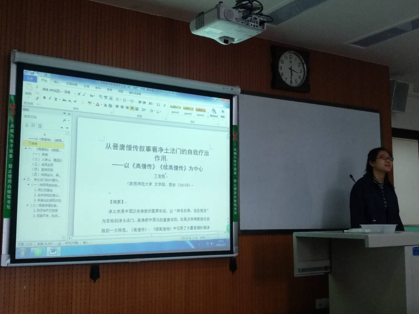 第112场博士学术报告以《从僧传叙事看晋唐佛教净土法门的治疗作用——以<高僧传>为中心展开》为题,由中国古代文学专业博士研究生丁良艳主讲。净土宗是中国汉传佛教的重要宗派,是以“持名念佛,往生极乐”为目标的净土法门,是佛教中国化的重要体现。丁良艳通过对“死亡即重生”、“生命存在的价值”等概念进行阐释,引发了同学们对生命的思考。现场互动频繁,气氛活跃。