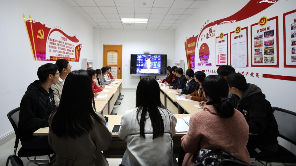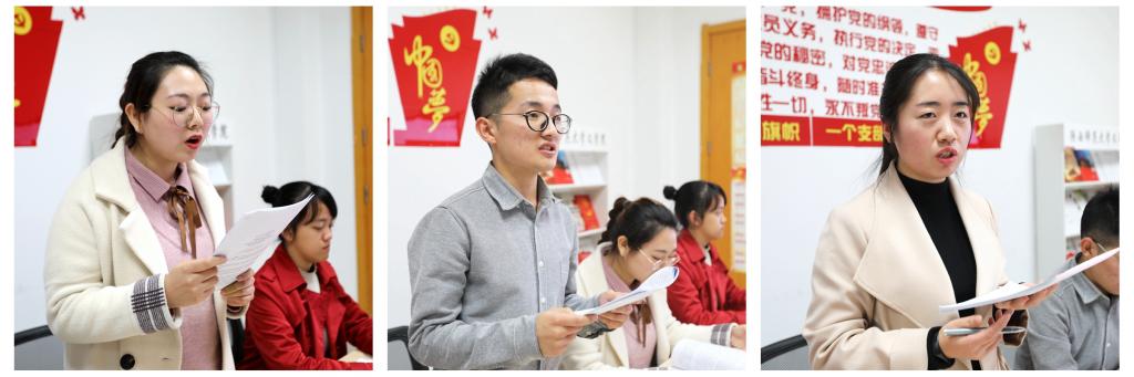 之后,马嘉宏、张文贺、付琳清、杨雨帆四名同学进行了主题诗歌朗诵。激昂澎湃的音乐、铿锵有力的朗诵,激励着支部成员要始终不忘初心、励志前行的责任与意识。