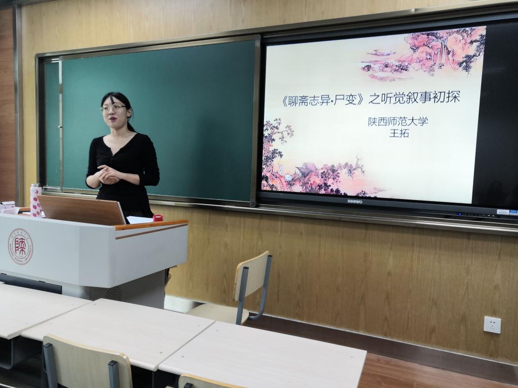 2019年11月25日,第150场博士学术报告以《<聊斋志异·尸变>之听觉叙事初探》为题,由比较文学与世界文学博士研究生林拓主讲。首先,林拓通过具体分析蒲松龄《聊斋志异》文本中显与隐声音的存在,揭示声音在叙事中的作用。接着,她对蒲松龄《聊斋志异•尸变》中的具体实例进行分析,发现文本中在表现声音时,悬念辞格的运用会使读者从感性到理性,反复辞格的运用则会使读者从理性到感性。最后,她通过讲述《尸变》中的一个恐怖故事,提出了恐怖美学对于文本中声音的调动。