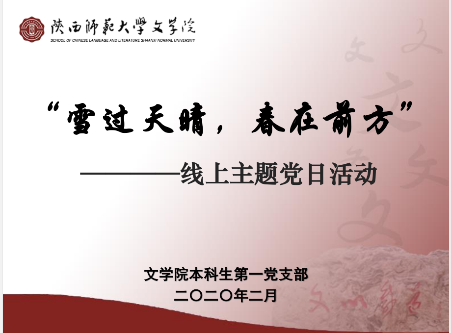 (通讯员:文苑)为深入贯彻落实习近平总书记关于疫情防控工作重要讲话和重要指示批示精神,充分发挥基层党组织战斗堡垒作用和党员先锋模范作用,2020年2月25日,bv伟德本科生第一党支部召开了“雪过天晴,春在前方”线上主题党日活动。活动由党支部书记尚梦帆主持。