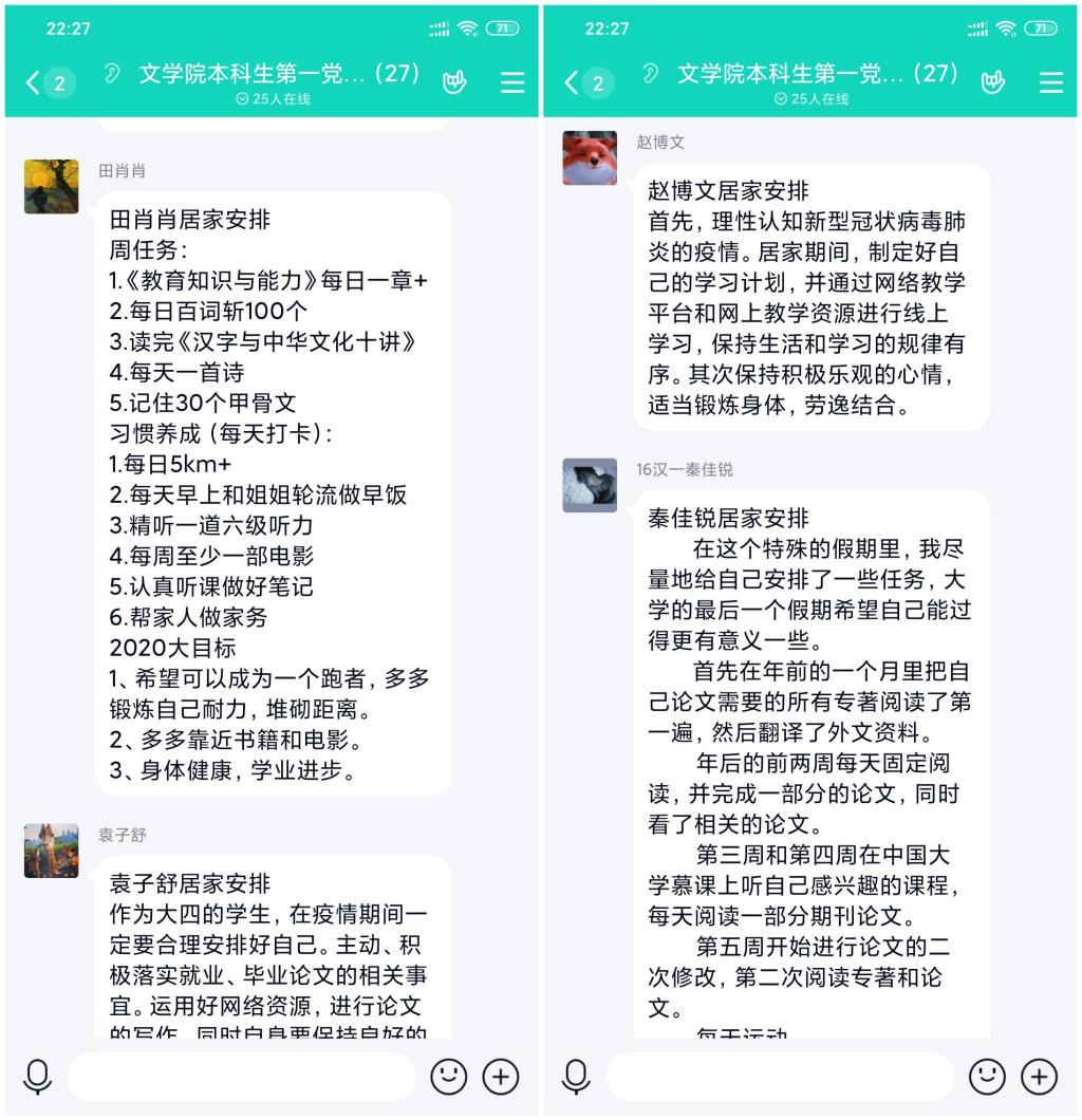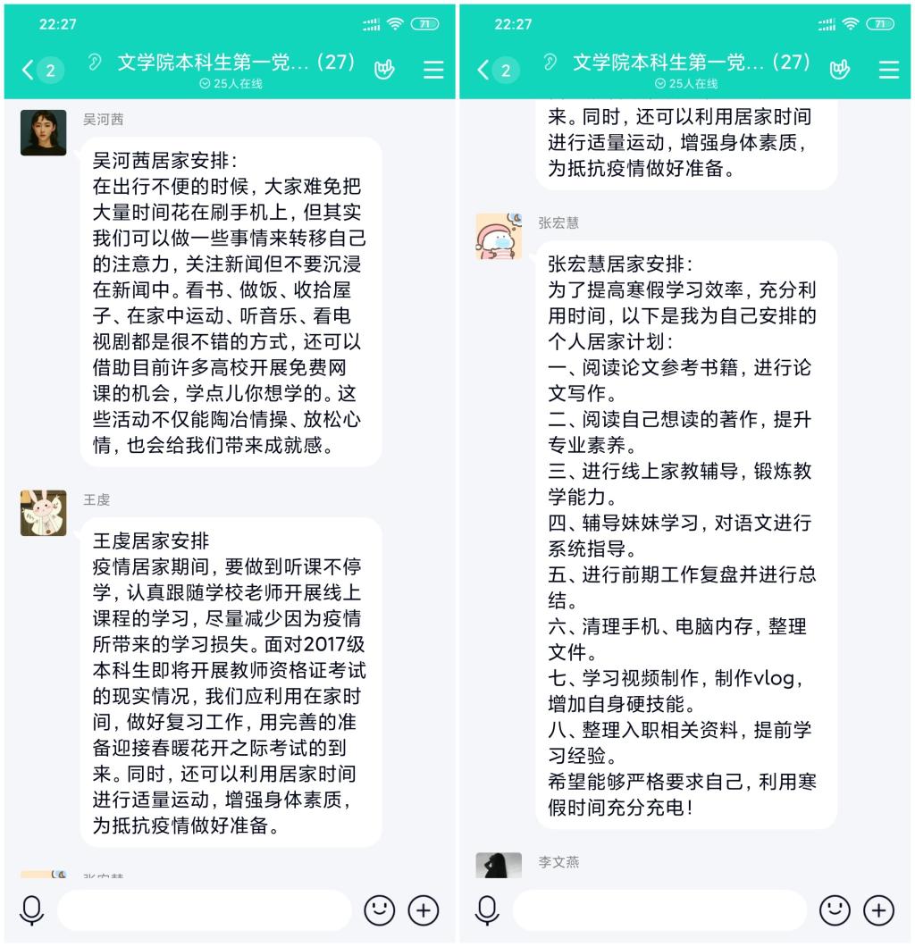 支部党员还分享了居家期间的学习、生活安排。居家期间,支部党员对时间进行了合理、细致的规划,在展开线上课程学习的同时加强身体锻炼,提升自身素质和专业技能,做到劳逸结合、秩序井然。最后,在支部党员“为武汉打气,为中国加油”的祝福中顺利结束本次党日活动。