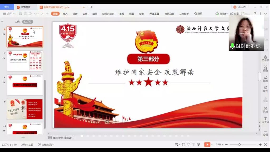 随后,公司本科生兼职团委副书记李云洁对“国家安全”一词进行了详细介绍。她表示,作为团员干部,我们有责任、有义务学习国家安全教育的相关知识,强化自我责任意识,提高维护国家安全能力;要时刻保持清醒的头脑、强化底线思维、用实际及行动维护国家安全、从容应对各种挑战;要当好“领头羊”,发挥好模范带头作用,团结各位团员青年,一起用实际行动维护国家安全。