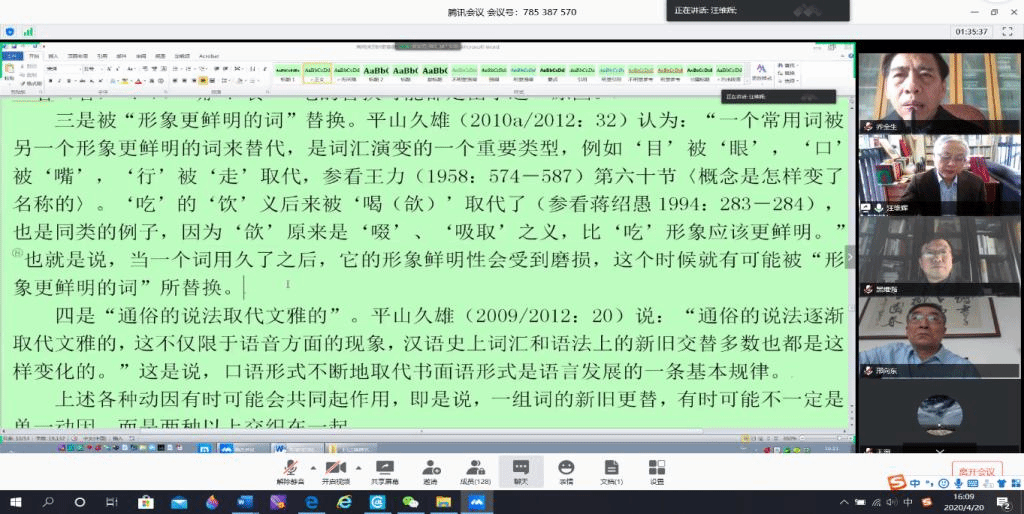 (通讯员:王淘)应bv伟德邀请,4月20日下午,浙江大学教育部重点研究基地汉语史研究中心主任汪维辉教授通过腾讯会议平台(会议号785387570)为公司师生做了题为“常用词历时更替研究的工作程序”的学术讲座。讲座由黑维强教授主持,乔全生教授、邢向东教授点评,党怀兴副董事长、赵学清、周广干等教师及语言学、文字学专业研究生共计130余人听取了讲座。