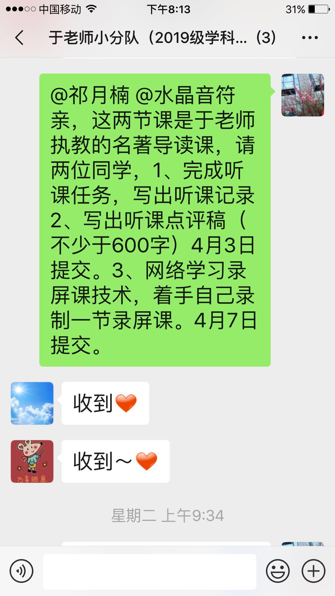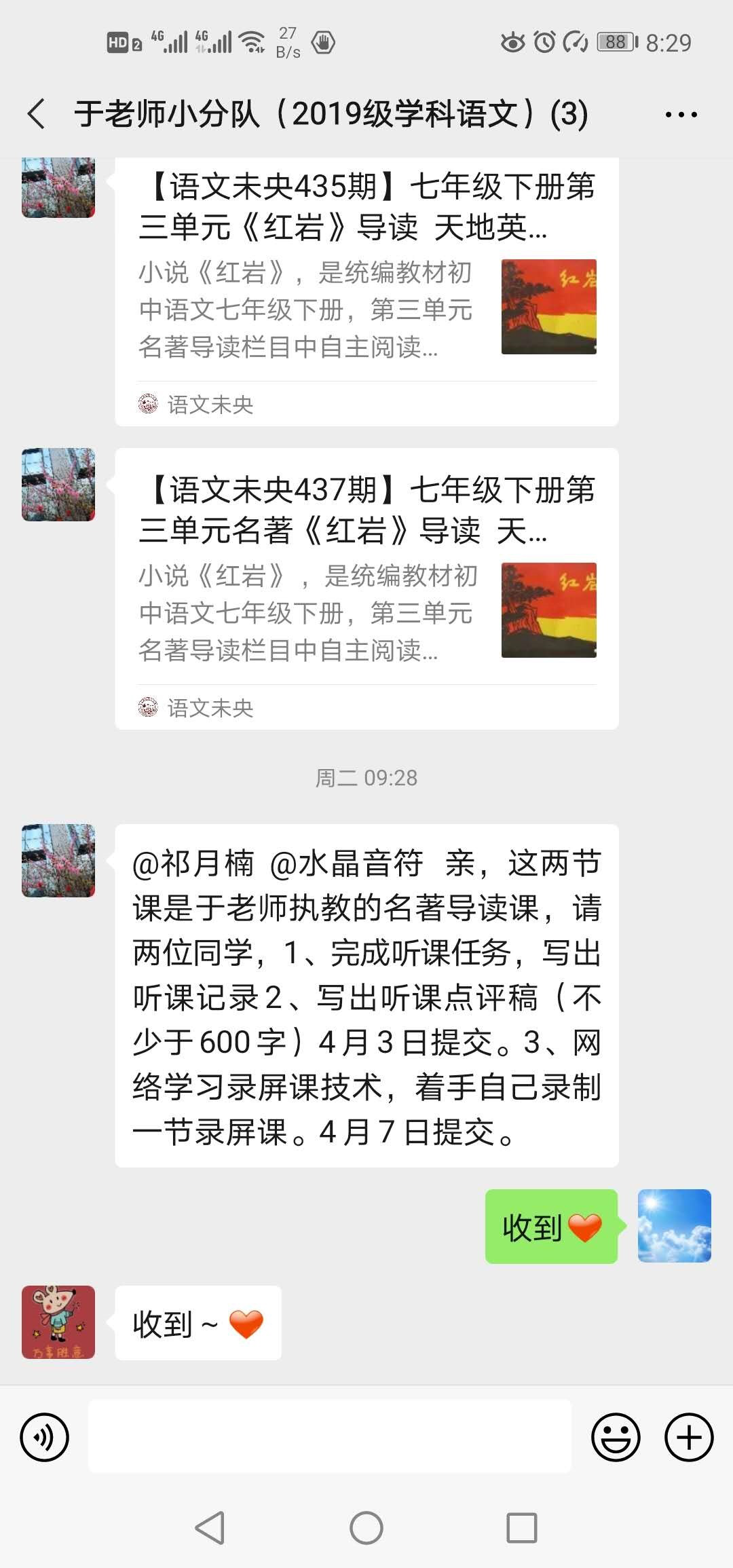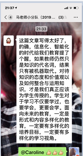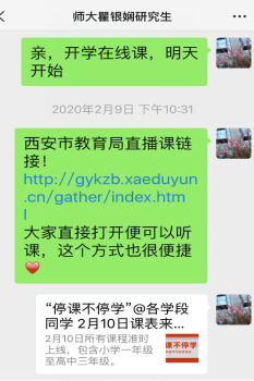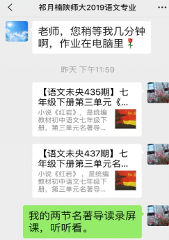 2.加入“语文教师QQ助学群”,理论与实践相结合,线上展开实习研修。于红梅老师组建了以未央区任教七、八年级语文教学老师为主的“未央区七、八年级语文助学群”,以QQ群分组,开展网络研课研学,合作交流,助学提升。将两位实习同学也加入到群里,使其与群组里的所有语文老师共同开展每日的教学活动,按计划学习教学理论,关注网络微课制作,听课评课、撰写感悟心得,汲取学养。在灾难和不幸面前,以更为开阔的视野融入到整个未央区中学语文课程的教学实践当中。