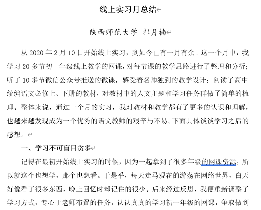 4.加强过程跟踪,及时开展阶段性总结,梳理教学实习的得与失。积极引导两位实习同学撰写个人实习月小结,在反思中引导老师关注自身成长。把理论与实践有机地结合在一起。