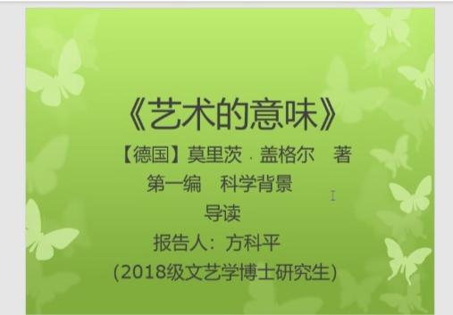 2020年4月30日,第153场博士学术报告以《莫里茨·盖格尔<艺术的意味>第一编导读》为题,由文艺学博士研究生方科平主讲。方科平的报告主要分为三部分,即作者及著作简介、文献选读、解说三部分。方科平首先简单介绍了“现象学”的概念,接着他在报告中指出盖格尔通过现象学还原把握住了审美价值所归属的“现象”,通过本质还原把握到了审美价值的“本质”,价值论美学的确立和现象学方法的运用在这里得到了有机的结合,最后他从对事实论美学的分析和批判、审美对象与先验还原、审美对象与本质直观三个方面进行了文本的解说。