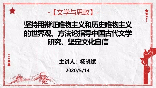 (通讯员:吴仪 图片:袁芳)5月14日19:00,bv伟德“文学与思政”系列讲座第十七讲线上开讲。bv伟德副经理杨晓斌教授以“坚持用辩证唯物主义和历史唯物主义的世界观、方法论指导中国古代文学研究,坚定文化自信”为主题,在腾讯会议进行了直播讲授。讲座由文公司党委副书记李斐主持。