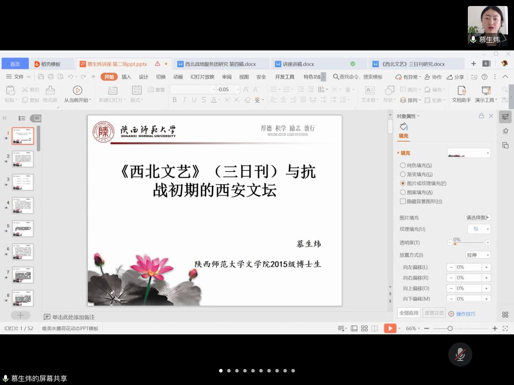 2020年5月11日,第156场博士学术报告以《<西北文艺>(三日刊)与抗战初期的西安文坛》为题,由中国现当代文学博士研究生慕生炜主讲。首先,她在报告中梳理了《西北文艺》(三日刊)的创刊始末,并强调这本刊物从主题、作者与刊物特点都与抗战时期的政治有紧密联系;接着慕生炜重点论述了《西北文艺》(三日刊)的价值意义;最后她在报告中指出,《西北文艺》(三日刊)抗战主题鲜明,大众化、民族形式、进步性的特点突出,体现了抗战初期西安抗战文艺的面貌。整场报告史料丰富,要点明晰,讲述生动。