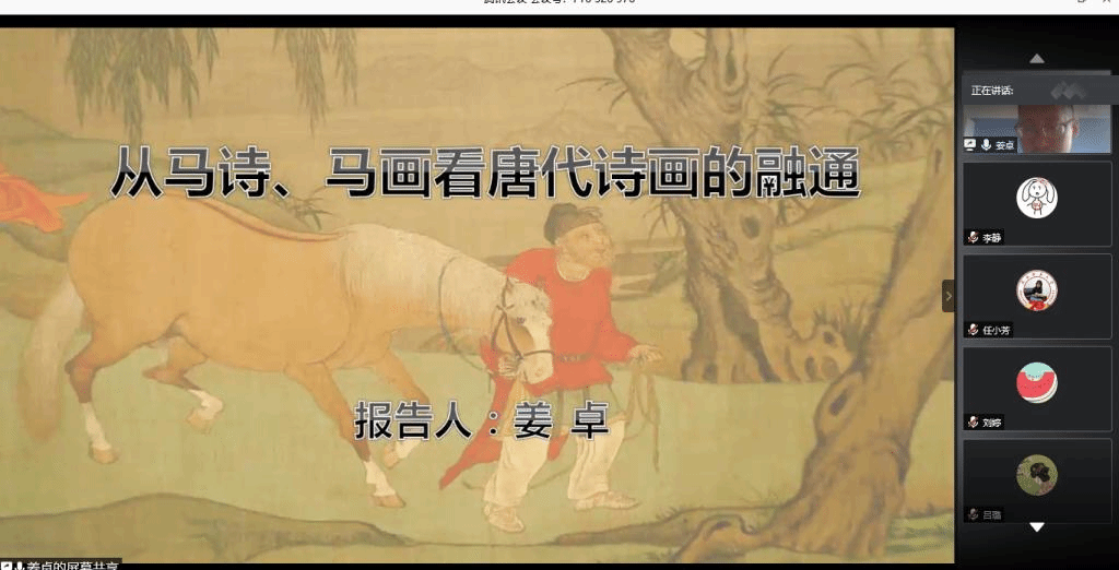 2020年5月15日,第161场博士学术报告以《从马诗、马画看唐代诗画的融通》为题,由中国古代文学专业博士研究生姜卓主讲。他在报告中首先以韩幹《照夜白》《牧马图》等作品为例分析了唐诗马绘画的意象元素。接着,他从《历代名画记》《唐朝名画录》中分析了唐代马画的写实与通神。最后,姜卓通过具体的作品说明借马画说马诗,分析了唐代诗画的融通境界。