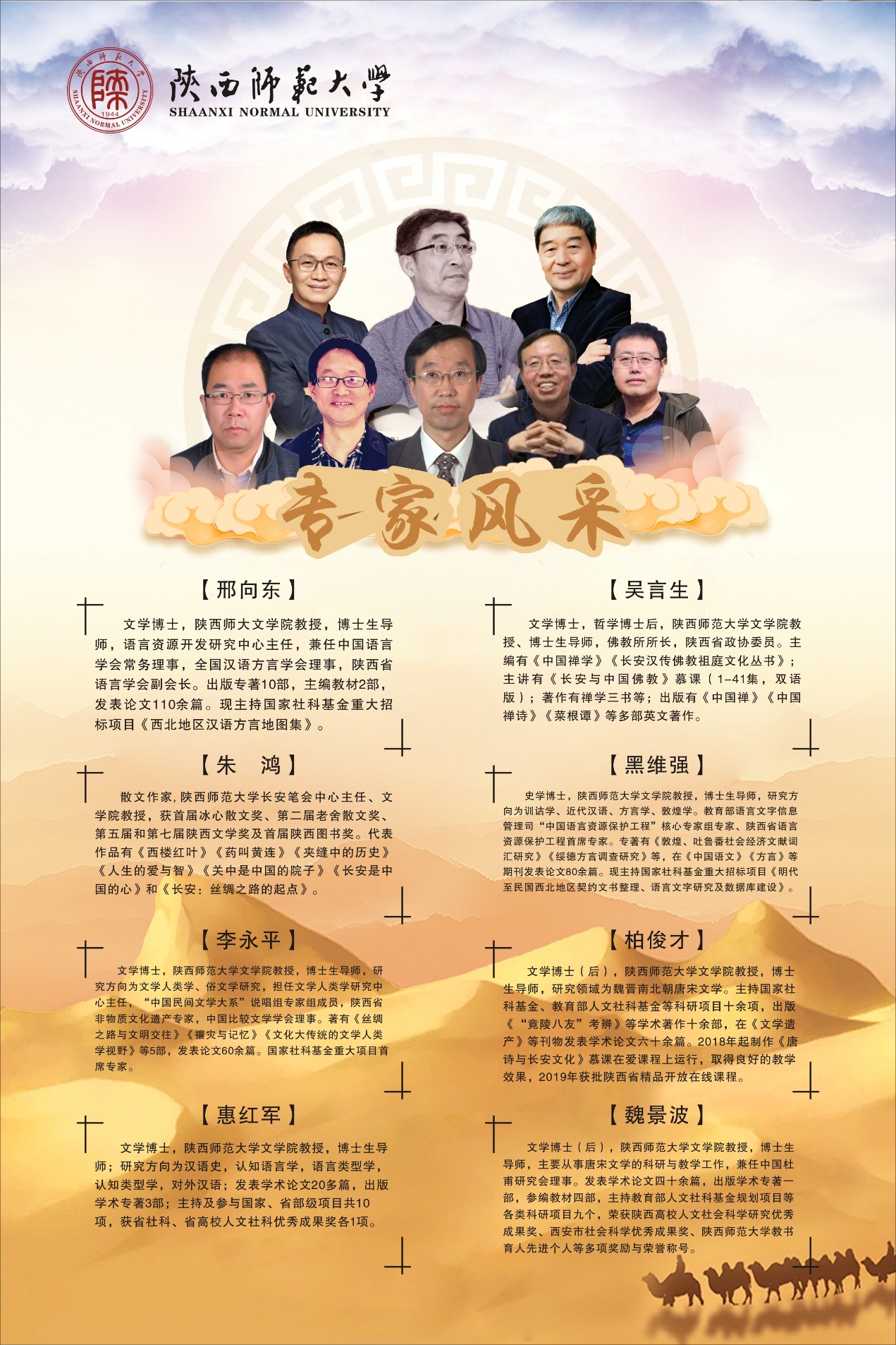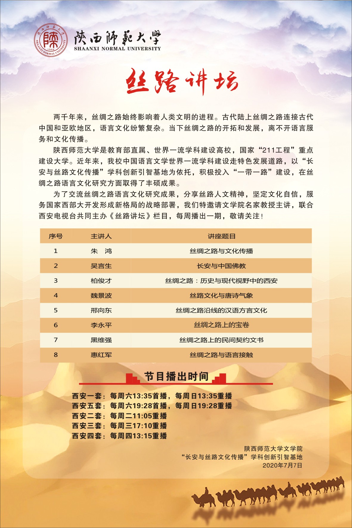 “丝路讲坛”栏目共设八讲,2020年7月11日播出第一期,每周六在西安一套、五套首播。讲坛邀请了bv伟德朱鸿、吴言生、柏俊才、魏景波、邢向东、李永平、黑维强、惠红军等8位专家学者,围绕“丝绸之路上的语言、文化”这一主题,面向社会各界人士,探讨丝路上的文明与传奇故事。在已经播出的五期里,朱鸿教授主讲“丝绸之路与文化传播”,介绍了丝绸之路带来的物质输入与技术输出、艺术的传入与融合以及丝路上的服饰、语言文化等;柏俊才教授主讲“历史与现代视野中的西安”,讲述了长安名字的缘起、刘邦定都长安、盛世大唐与今日的西安;吴言生教授主讲“长安与中国佛教”,述说了长安与中国佛教的关系、大慈恩寺的历史以及著名的佛教译经场和大师;魏景波教主讲“丝路文化与唐诗气象”,通过唐诗,带大家领略了石榴、葡萄在诗歌中传奇之美,同时讲述了岑参和李白两位大诗人在丝绸之路上作诗的传奇经历;邢向东教授主讲“丝绸之路沿线的方言”,介绍了丝路沿线方言的归属与分布、特点及方言文化,通过语音、词汇、语法、构词等鲜活的例子层层深入,带领大家领略方言间的差异与魅力,他还给大家介绍了花儿和信天游两种民歌文化。即将播出的三期,还将为大家呈现丝绸之路上的契约文书、宝卷研究和语言接触等主题。