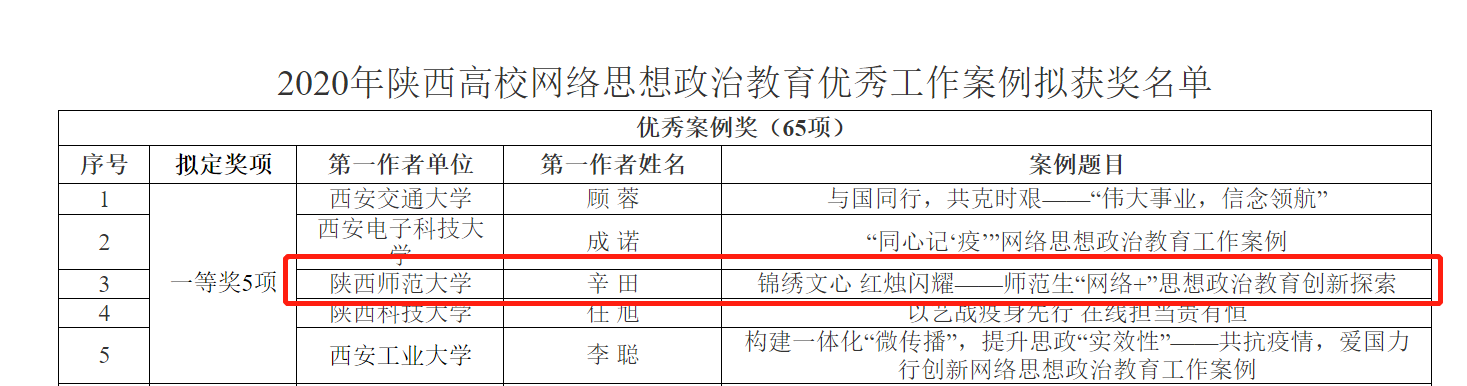 (通讯员:王鑫)近日,陕西高校网络思想政治教育优秀工作案例评选结果公布,公司喜获佳绩。公司团委书记辛田、辅导员范虹鹭撰写的《锦绣文心,红烛闪耀——师范生“网络+”思想政治教育创新探索》获得一等奖,辅导员王鑫撰写的《屏对屏隔空相见,心连心教育引导——依托“四有”网络云班会把握思想政治教育“危中之机”的探索》获得三等奖。