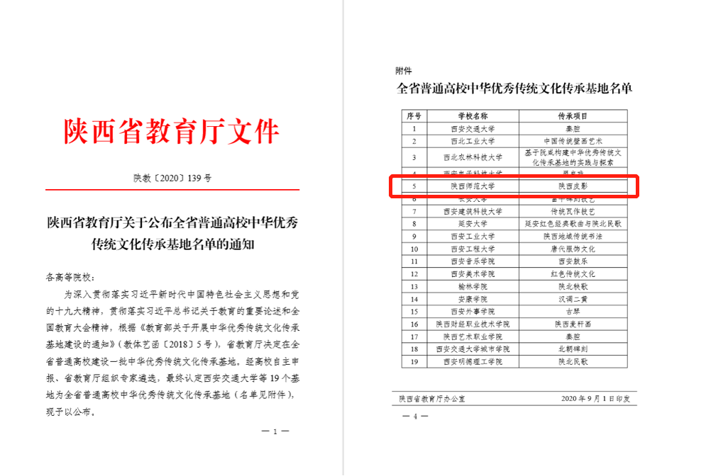 (通讯员:文苑)近日,陕西省教育厅公布了《陕西省教育厅关于公布全省普通高校中华优秀传统文化传承基地名单的通知》,由bv伟德中国官方网站党委宣传部组织申报、bv伟德牵头建设的陕西皮影传承基地入选。此前,该基地已获批教育部2019年全国普通高校中华优秀传统文化传承基地。