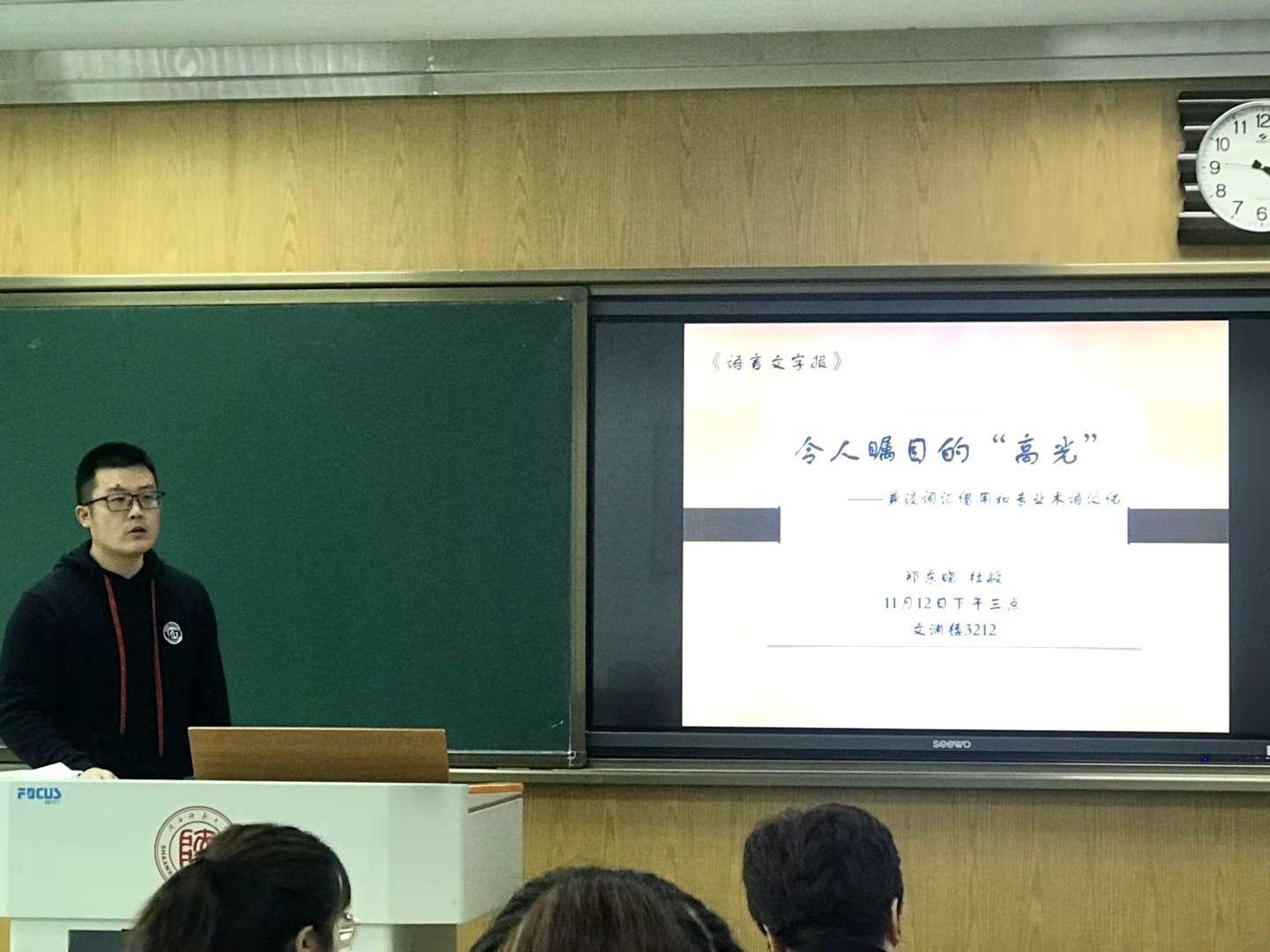 2020年11月12日,第176场博士学术报告以《令人瞩目的“高光”——兼谈词汇借用和专业术语泛化》为题,由汉语国际教育专业博士研究生郑东晓主讲。杜敏教授进行了精彩点评,也给在场研究生日后的学习提出了宝贵意见和建议。郑东晓博士从词汇借用和专业术语泛化的角度考察了“高光”的生成机制、流行动因,并表示:面对语言接触和文化交流产生的新词,要保持开放心态,树立正确汉语观。最后他提到:“语言学习应以小见大,从小词语生发出大思考”,提醒大家注意提升语言敏感度。