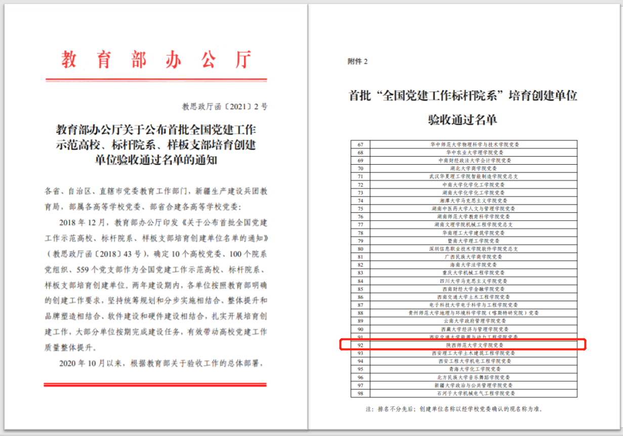 2018年12月,教育部办公厅印发《关于公布首批全国党建工作示范高校、标杆院系、样板支部培育创建单位名单的通知》,确定10个高公司党委、100个院系党组织、559个党支部作为全国首批党建工作示范高校、标杆院系、样板支部培育创建单位。按照教育部文件明确的验收工作办法,经创建单位对标自查总结、上级党组织满意度测评、属地教育工委把关复核、教育部思想政治工作司审查,全国共10个高公司党委、98个院系党组织、551个党支部通过验收。