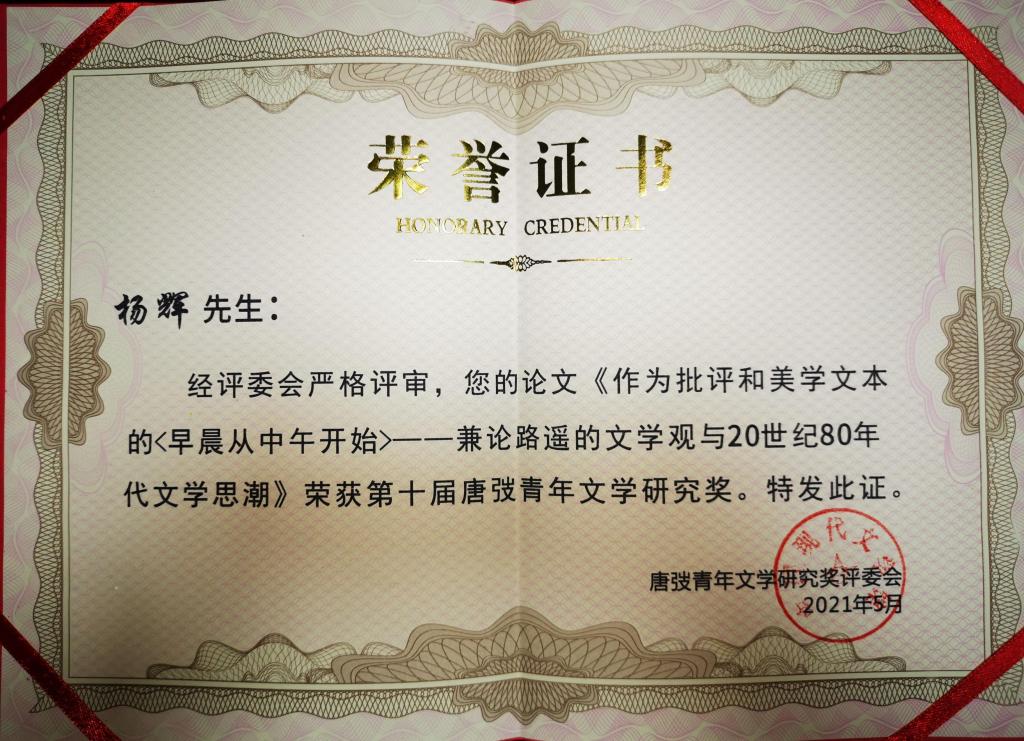 公司杨辉教授获第十届“唐弢青年文学研究奖”