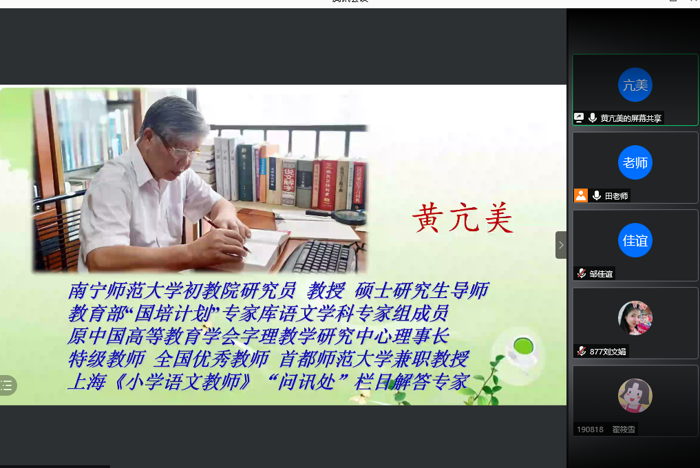 (通讯员:曹亚敏)2021年5月13日晚,“教师教育研习·名师讲坛”系列讲座第七场顺利举办。本场讲座特别邀请了南宁师范大学研究员黄亢美老师主讲,题目为“高师生应具有的汉字文化素养”。本次讲座由bv伟德教授贺卫东老师主持,通过腾讯会议线上开展,bv伟德大三、大四师范生聆听了本次讲座。