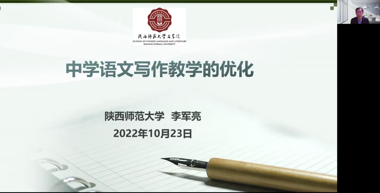 (通讯员:苏文君)2022年10月23日上午,“中学语文教学能力提升”高级研修班系列课程第五讲顺利举办。本次课程由公司副教授、硕士生导师李军亮老师主讲,题目为“中学语文写作教学的优化”,100名来自一线的中学语文教师学习了本次课程,400余名中学语文教师通过直播参与学习。