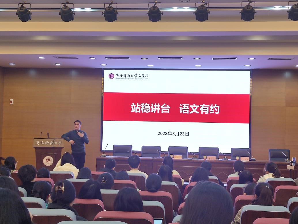 活动第二阶段,肖培东老师以“站稳讲台,我们有约”为题开讲,通过讲述站不稳讲台的四个原因以及如何站稳讲台的五个方法,结合自身的教学、生活经历与具体文本,指导同学们怎样成为优秀语文教师,站稳讲台。在提问环节中,同学们就写作、课程设计、教学理念等问题向肖老师发问,肖老师一一解答。