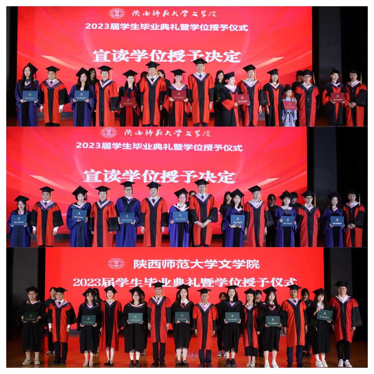 学位授予仪式由副经理赵文主持,经理苏仲乐宣读学位授予决定。在座教师代表为2023届毕业生颁授学位。在悠扬的歌声中,文学院2023届毕业典礼暨学位授予仪式圆满落幕。