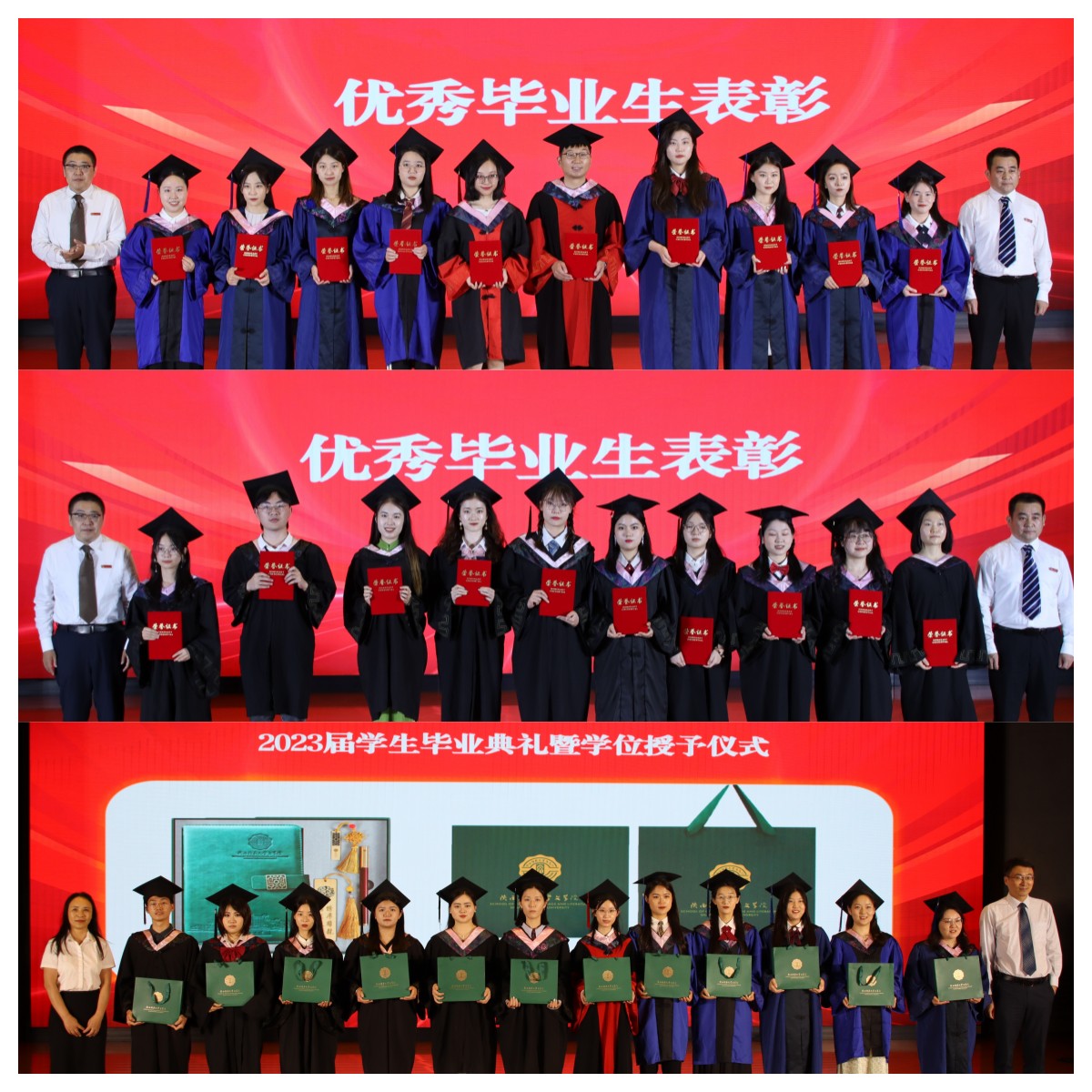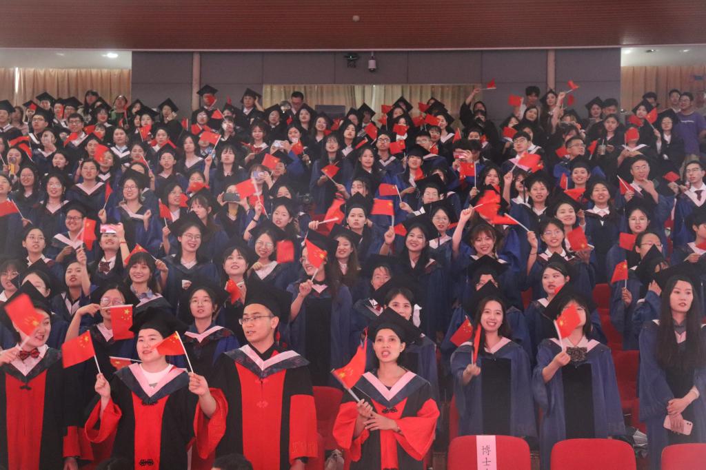 全体毕业生用铿锵有力的声音郑重宣誓,铮铮誓言,字字千钧,既是初心使命的庄严承诺,更是持续奋斗的赤诚告白。随后,2023届毕业生共同唱响《我和我的祖国》《再见》,用歌声告白祖国、告白母校、告别师友。
