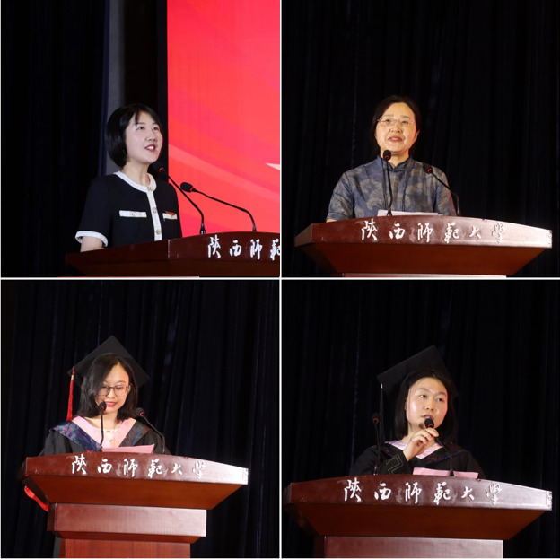 谢欣然老师作为教师代表发言。她向全体毕业生表示诚挚祝贺,回顾了大学求索文学奥义的难忘经历。她期望毕业生始终葆有对美、自由、梦想的渴望,积极探索庸常人生中崭新的可能性,胸怀“无穷的远方,无数的人们”,以文学工作者的责任担当真诚求索,赤忱前行。