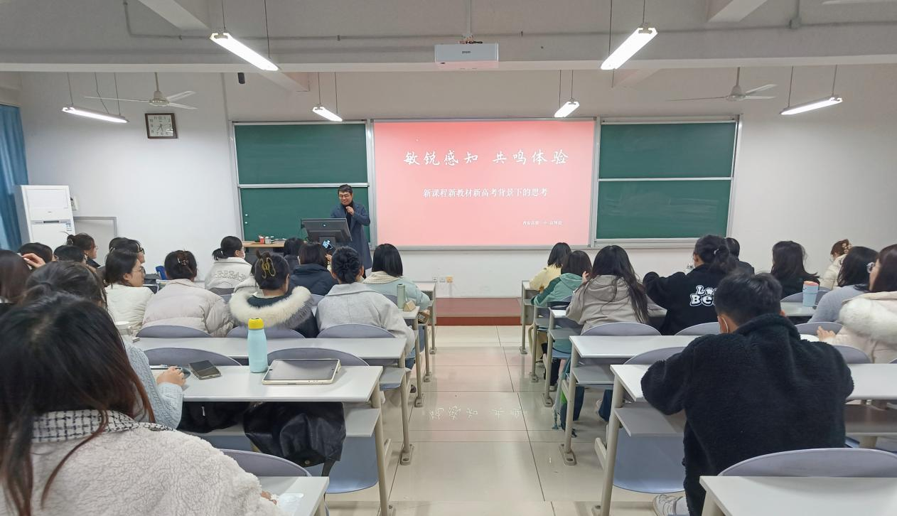 报告最后,高老师回归主题,指出语文教师的课堂应与员工有共鸣、与时代有共鸣,应对任何事情都有体验并与员工交流,形成场效应。人的课堂语言不单纯来自于嘴里的语言,同时可以通过眼神、手势、表情等展现,多多关注自己的视频,提升自我水平,尽可能呈现出一节更完整、更完美的课堂。